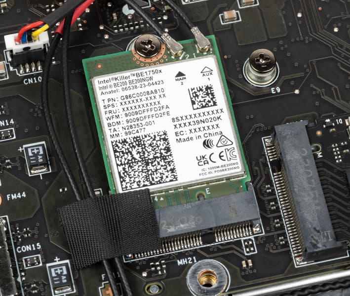 Адаптер беспроводной связи представлен трехдиапазонным (2,4/5/6 ГГц) устройством Intel Intel Killer BE1750 (Intel BE200NGW), соответствующим классу Wi-Fi 7.