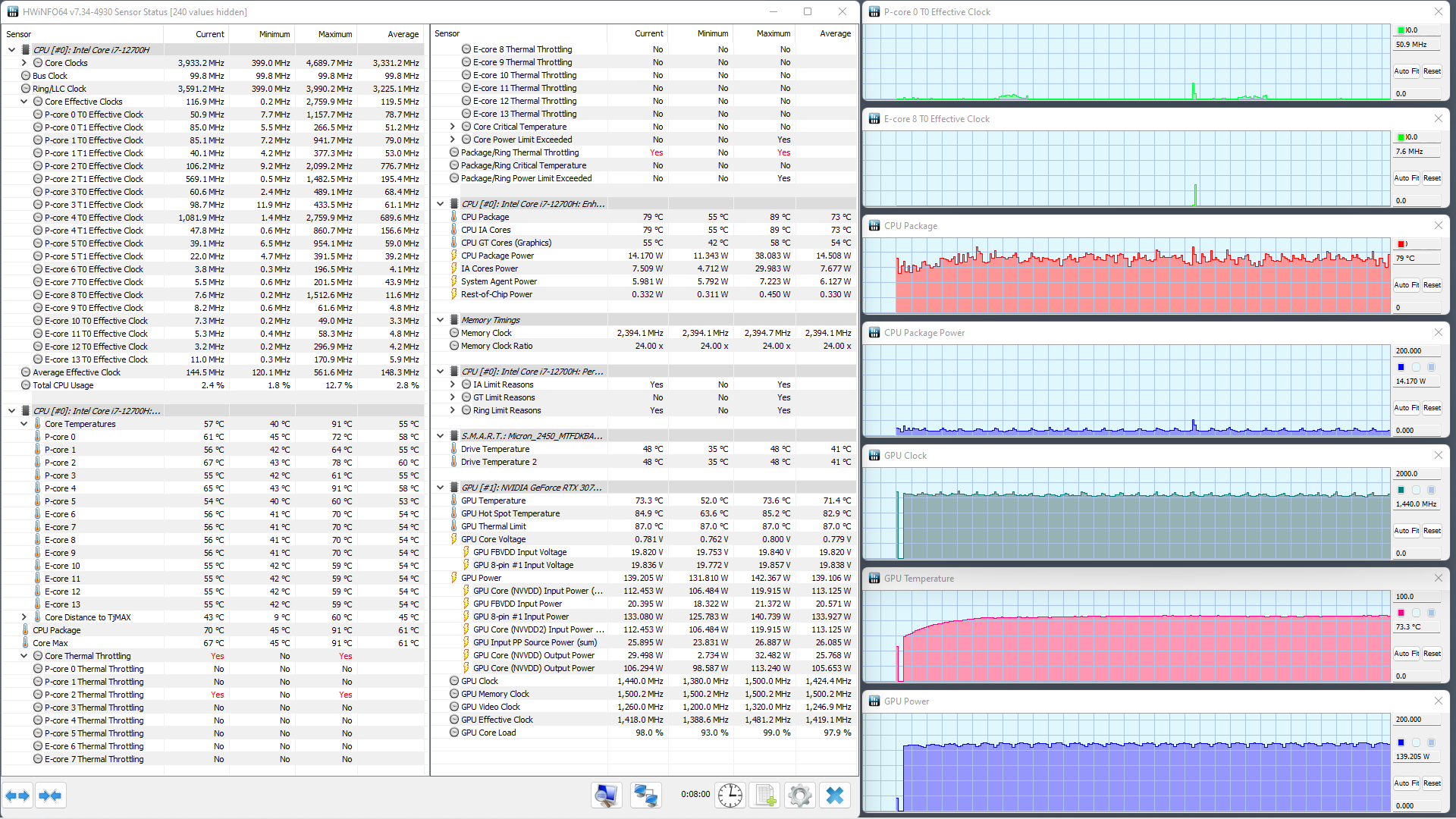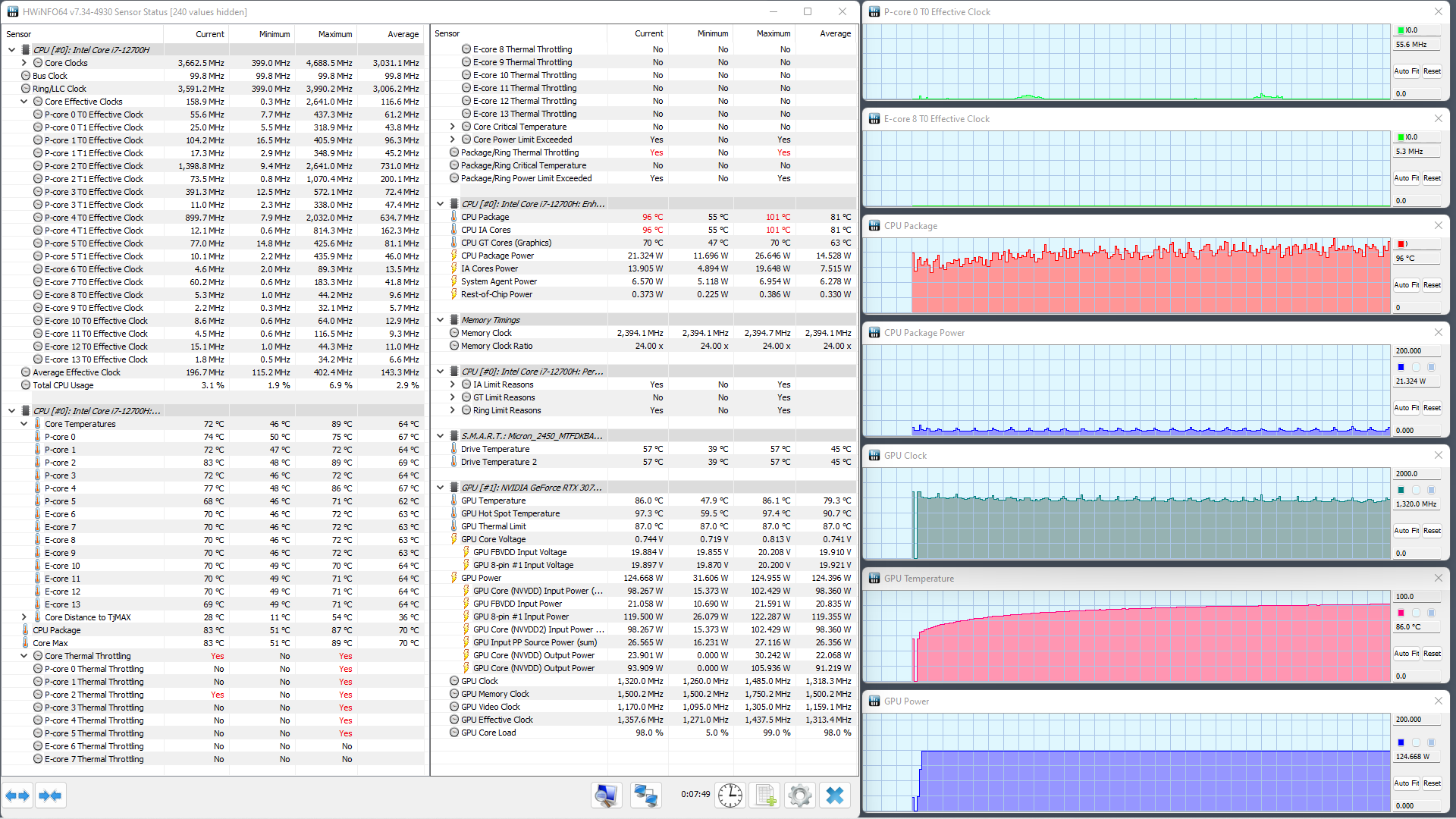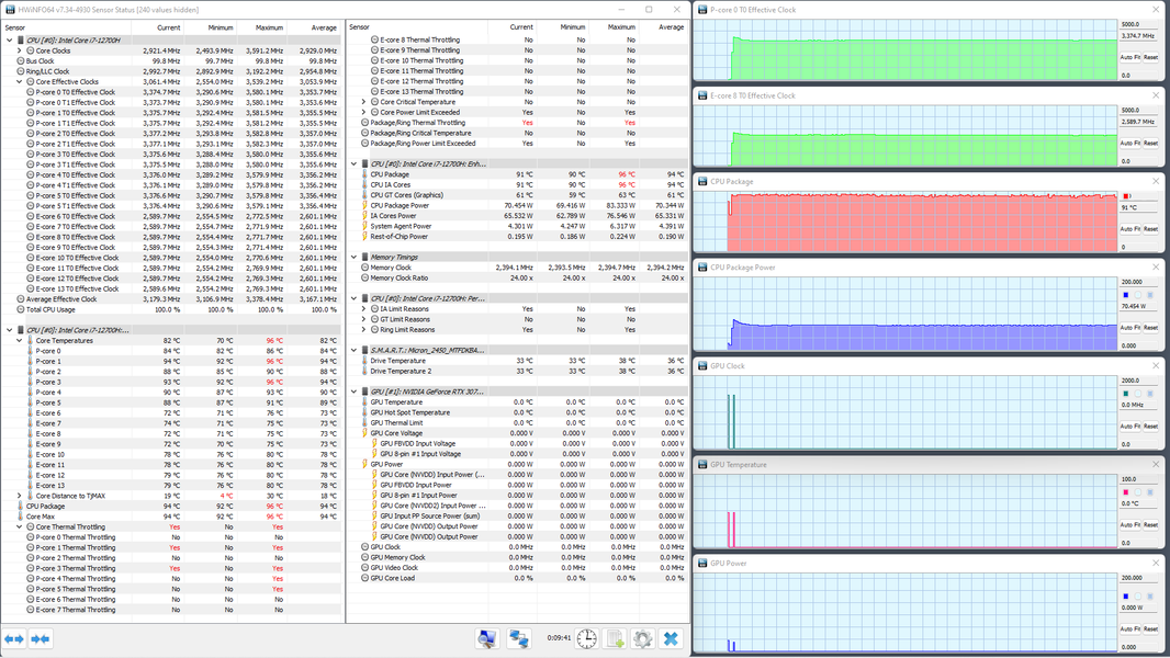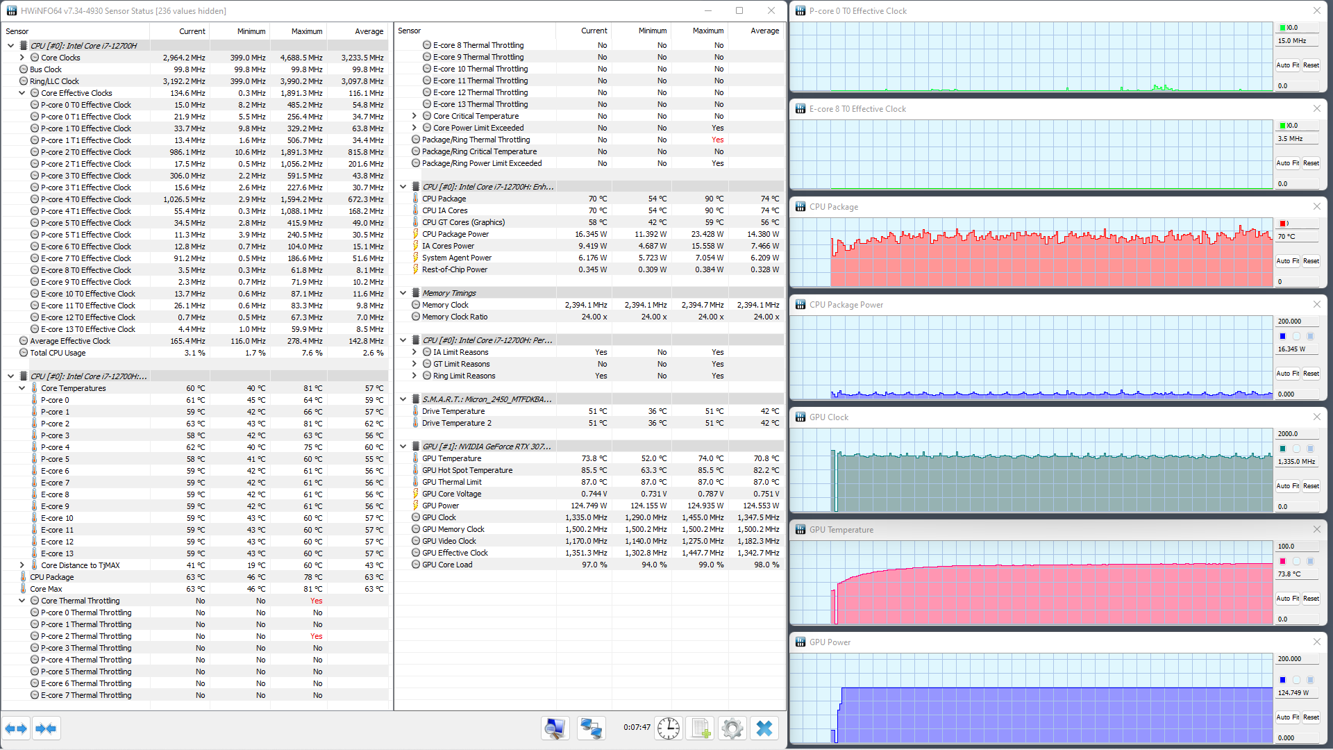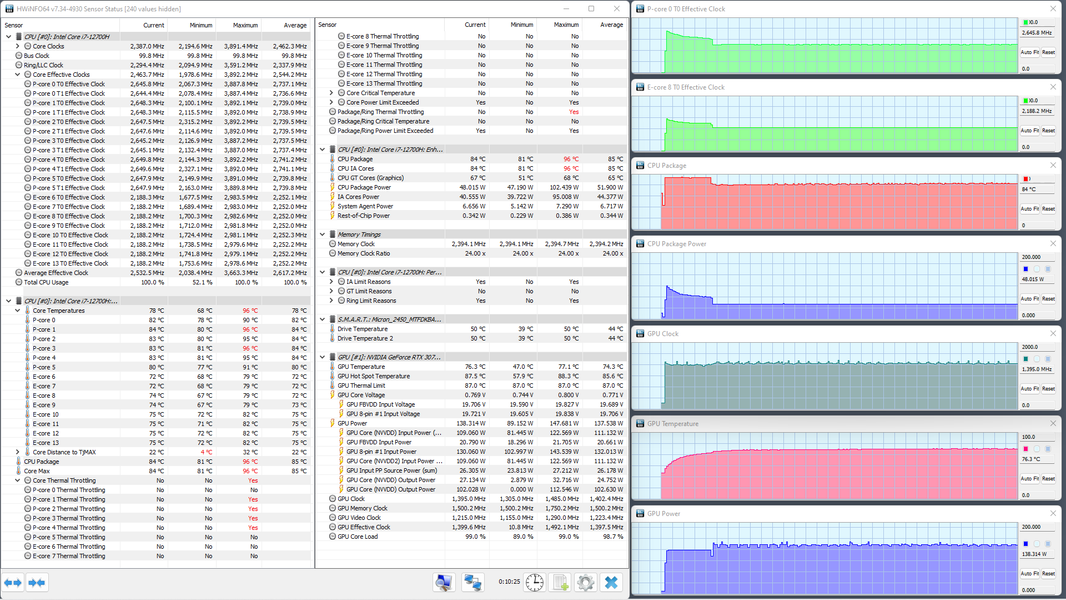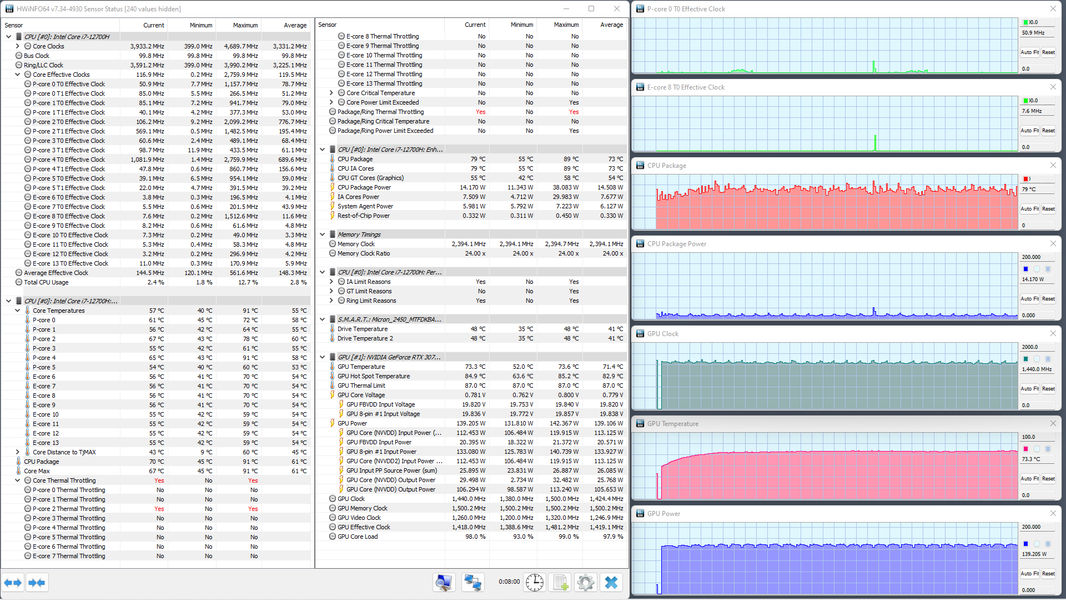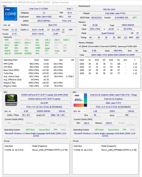 MSI Vector GP66 12UGSO-671RU оснащен мобильным процессором Intel Core i7-12700H (кодовое наименование Alder Lake). В его распоряжении 6 высокопроизводительных, или P-ядер (Performance cores), работающих в два потока (до 4,7 ГГц), и 8 энергоэффективных однопоточных, или E-ядер (Efficient cores, до 3,7 ГГц). Теплопакет — 45 Вт в стандартном и 115 Вт в турборежиме. В тестировании под нагрузкой мы видели, что в высокопроизводительных пользовательских сценариях работы (AI Smart Auto, Extreme Performance, Balanced) среднее потребление процессора под нагрузкой составляет примерно 70 Вт, что намного превышает паспортное значение.