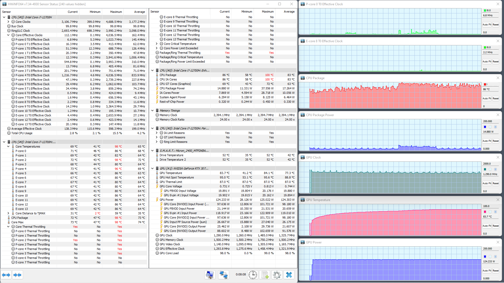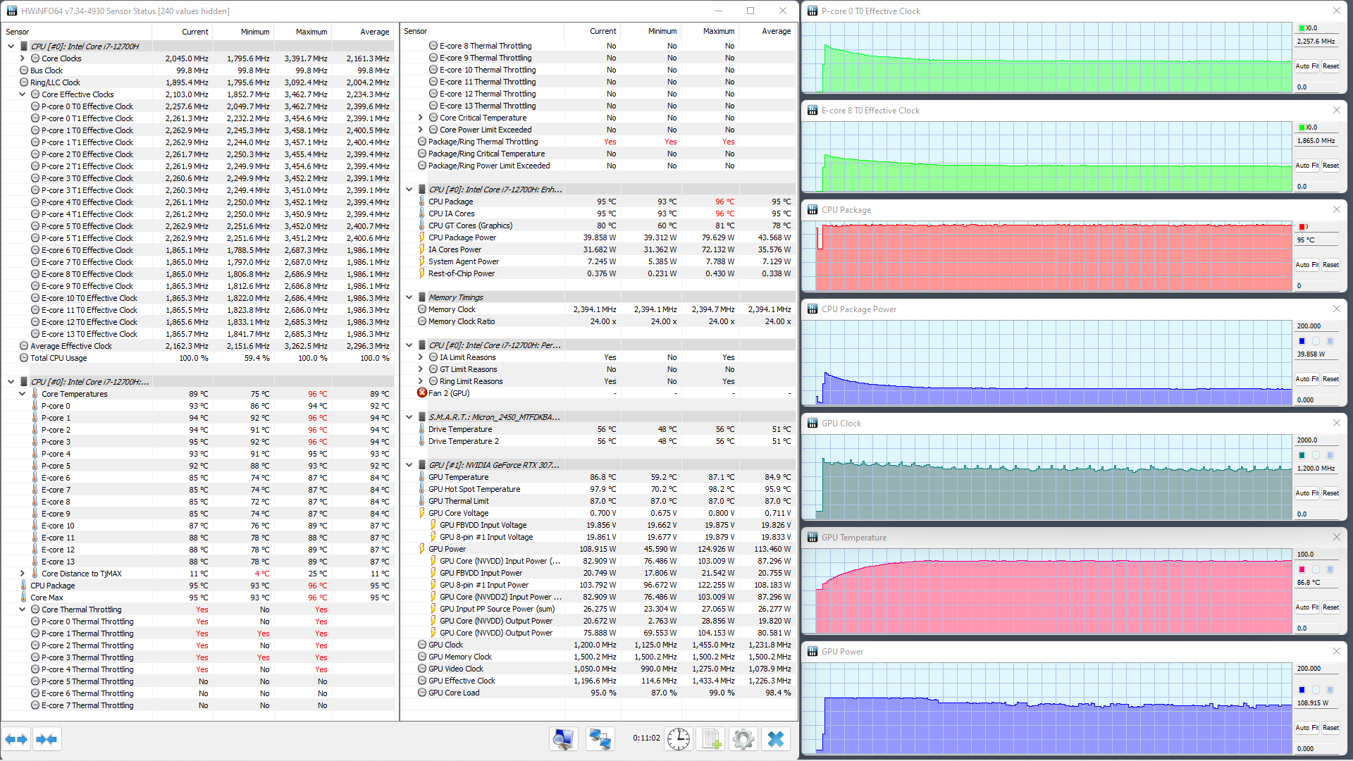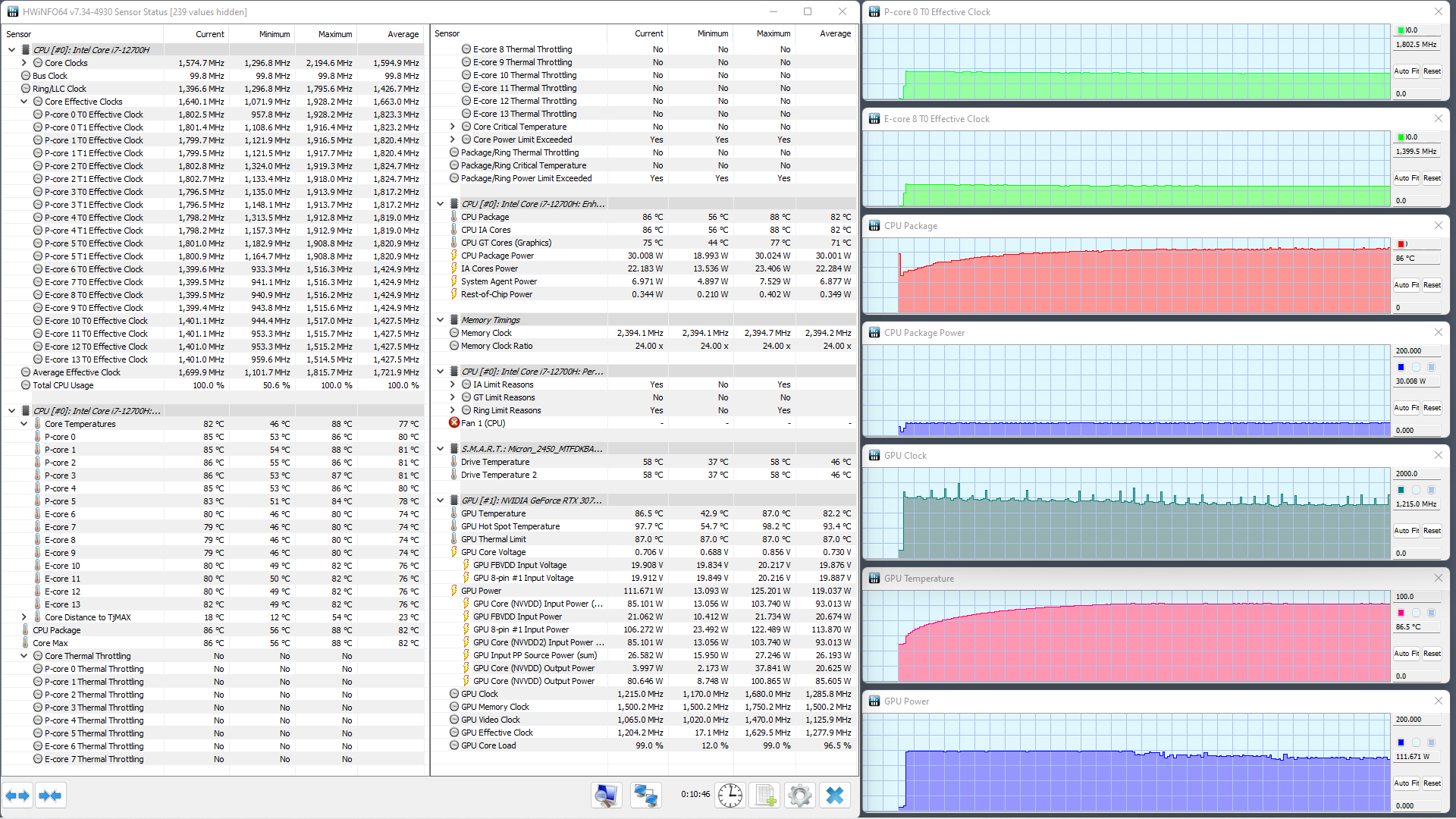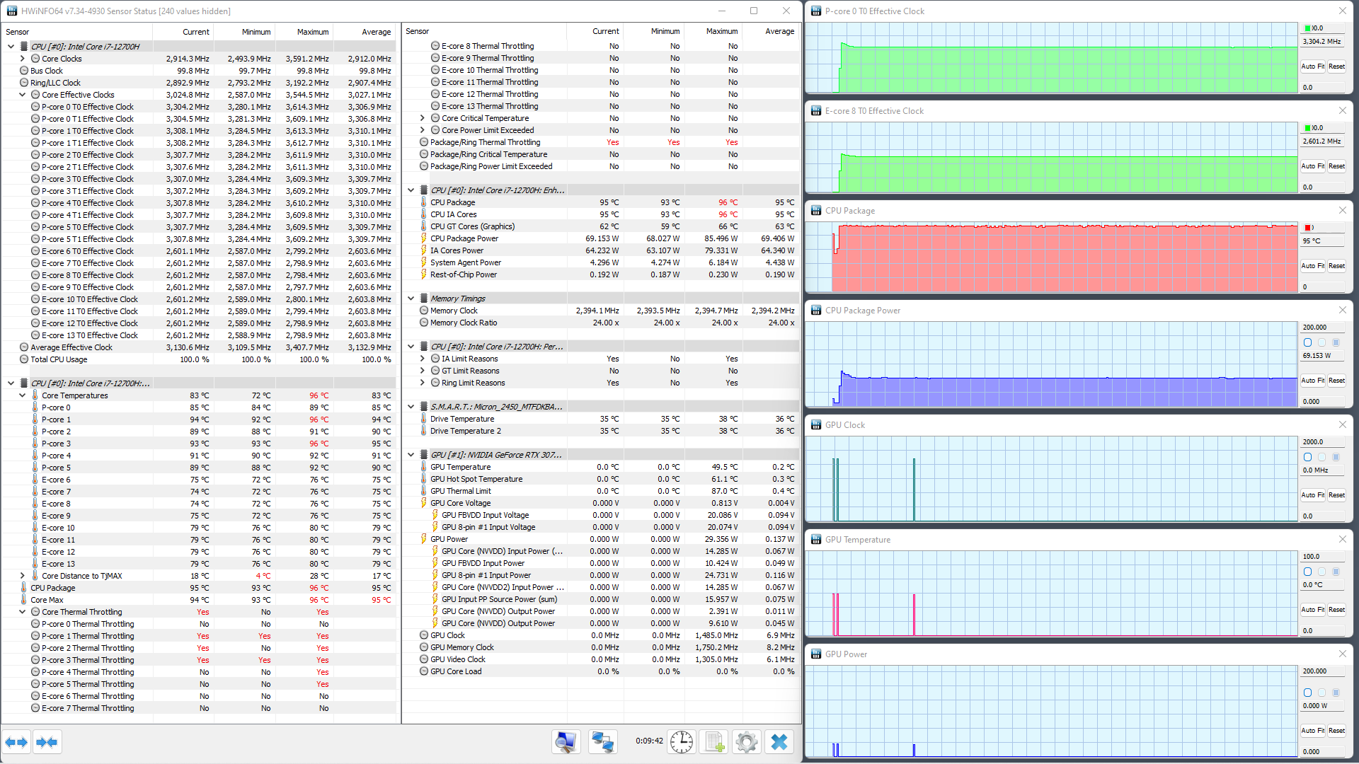 MSI Vector GP66 12UGSO-671RU оснащен мобильным процессором Intel Core i7-12700H (кодовое наименование Alder Lake). В его распоряжении 6 высокопроизводительных, или P-ядер (Performance cores), работающих в два потока (до 4,7 ГГц), и 8 энергоэффективных однопоточных, или E-ядер (Efficient cores, до 3,7 ГГц). Теплопакет — 45 Вт в стандартном и 115 Вт в турборежиме. В тестировании под нагрузкой мы видели, что в высокопроизводительных пользовательских сценариях работы (AI Smart Auto, Extreme Performance, Balanced) среднее потребление процессора под нагрузкой составляет примерно 70 Вт, что намного превышает паспортное значение.