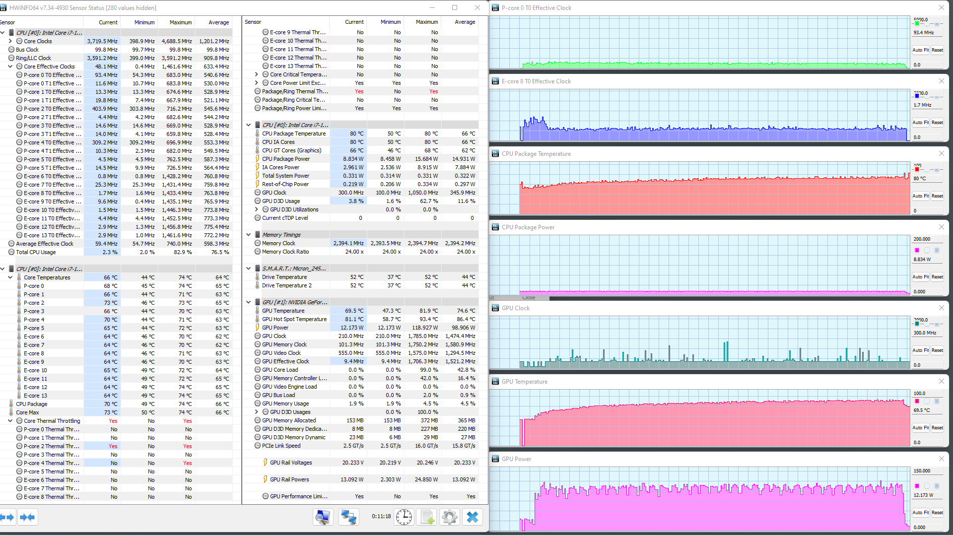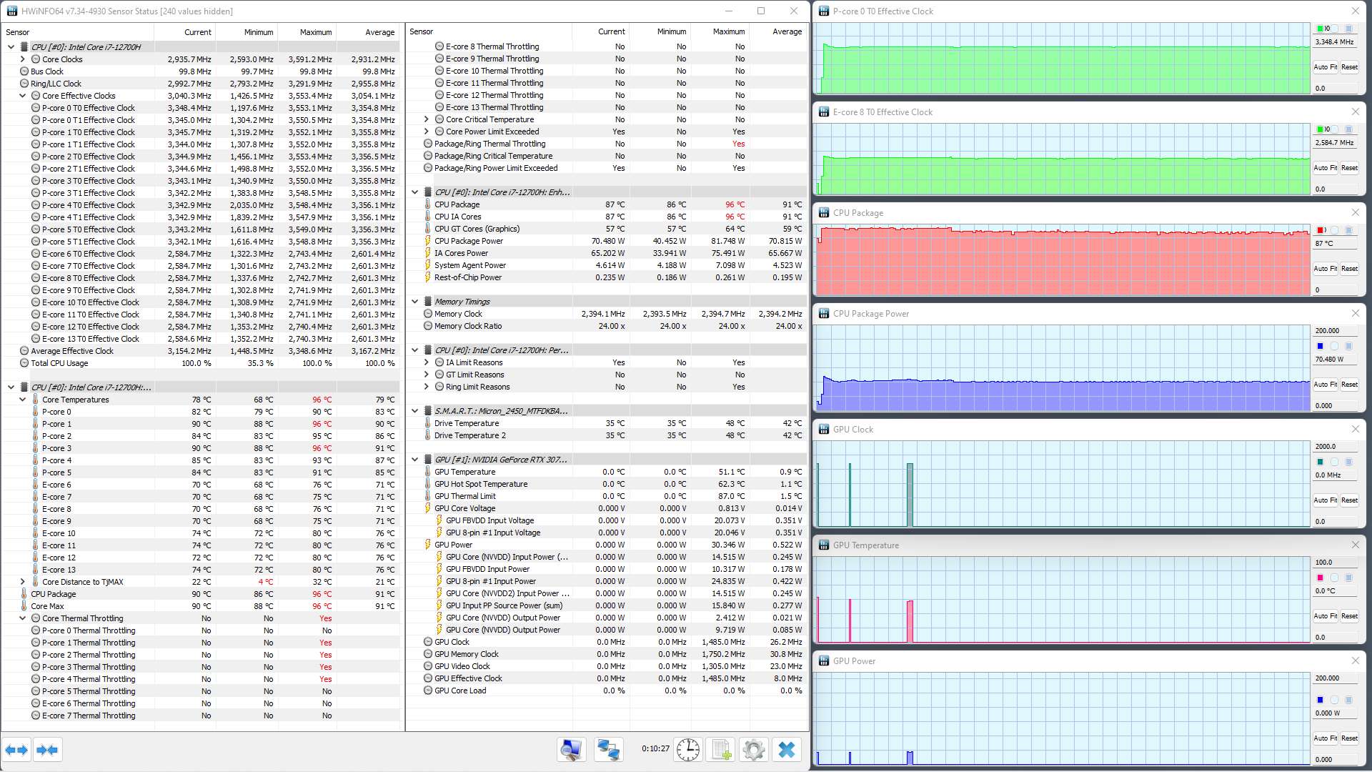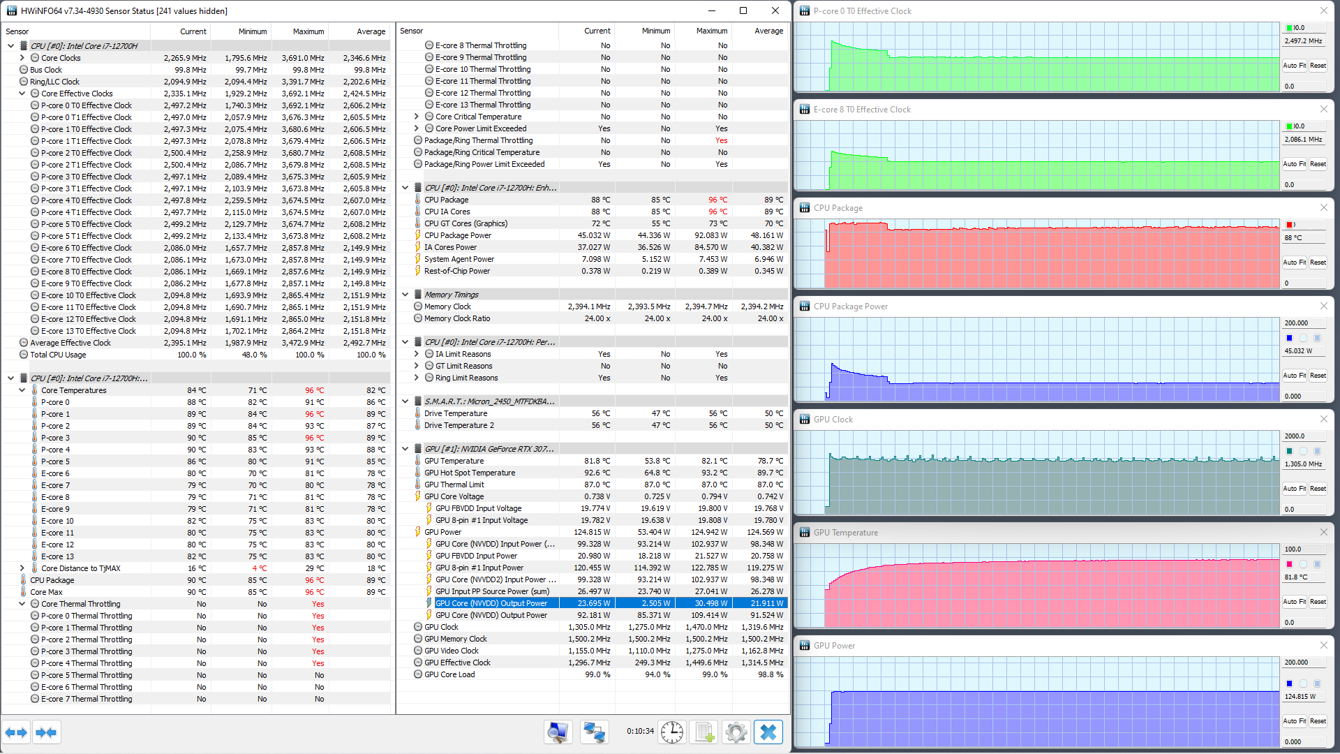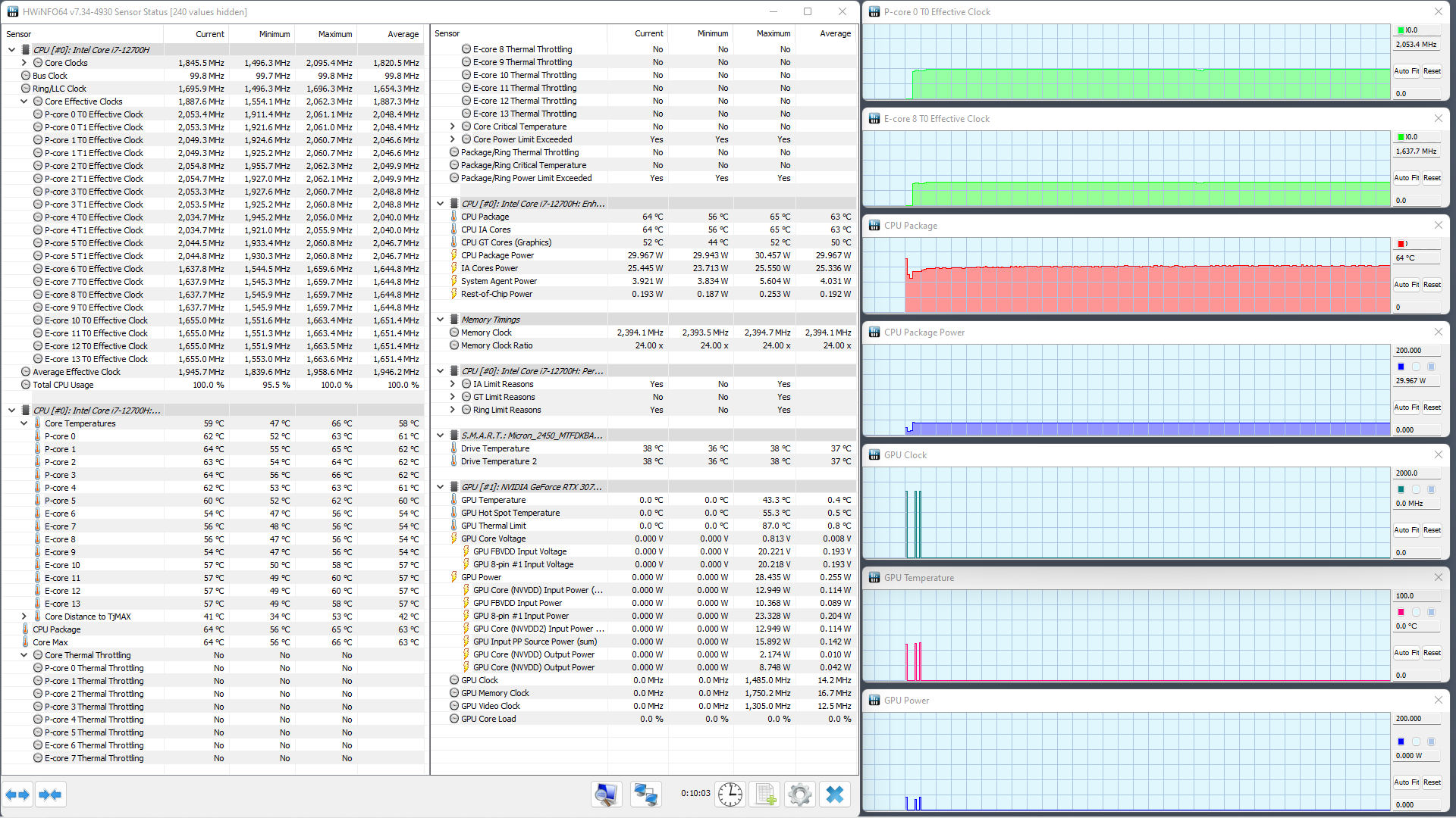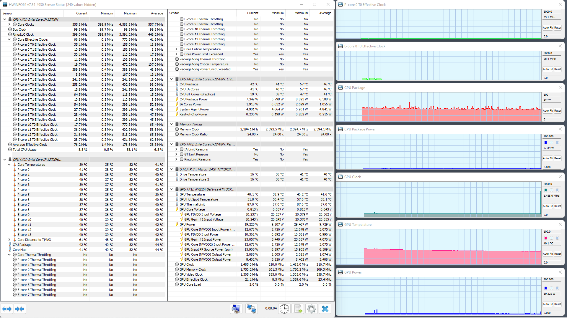 MSI Vector GP66 12UGSO-671RU оснащен мобильным процессором Intel Core i7-12700H (кодовое наименование Alder Lake). В его распоряжении 6 высокопроизводительных, или P-ядер (Performance cores), работающих в два потока (до 4,7 ГГц), и 8 энергоэффективных однопоточных, или E-ядер (Efficient cores, до 3,7 ГГц). Теплопакет — 45 Вт в стандартном и 115 Вт в турборежиме. В тестировании под нагрузкой мы видели, что в высокопроизводительных пользовательских сценариях работы (AI Smart Auto, Extreme Performance, Balanced) среднее потребление процессора под нагрузкой составляет примерно 70 Вт, что намного превышает паспортное значение.