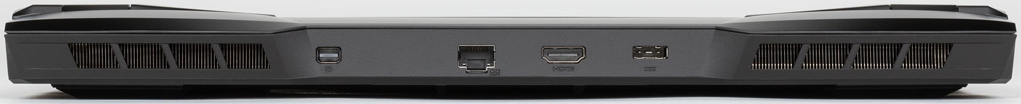 На задней панели заметны решетки отверстий, через которые наружу выбрасывается горячий воздух. Слева направо помещаются Mini-DisplayPort, RJ-45 Ethernet, HDMI и проприетарный разъем для подключения адаптера питания.