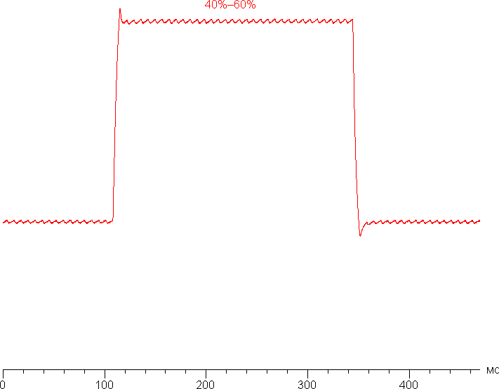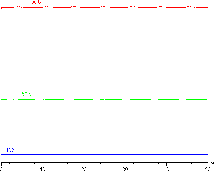 На любом уровне яркости значимая модуляция подсветки отсутствует, поэтому нет и никакого мерцания экрана. В доказательство приведем графики зависимости яркости (вертикальная ось) от времени (горизонтальная ось) при различных значениях настройки яркости: