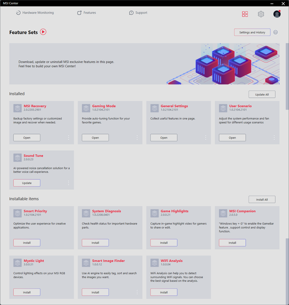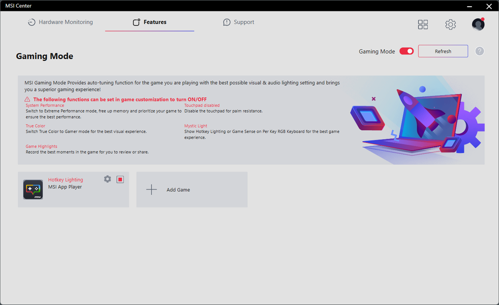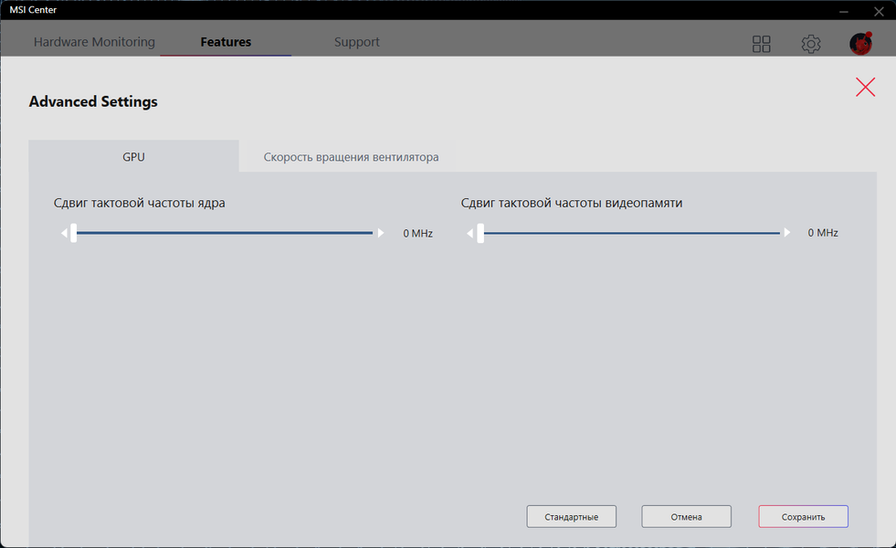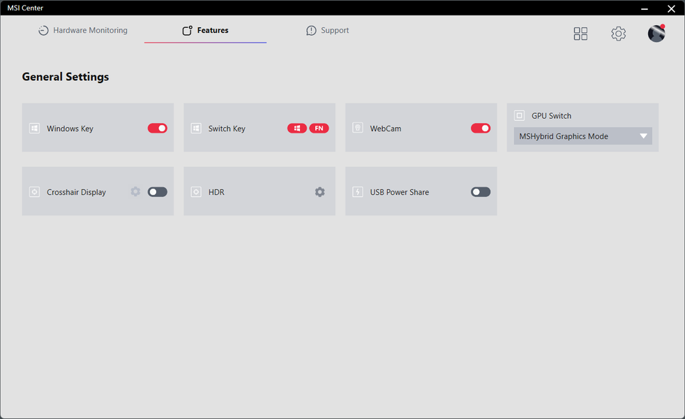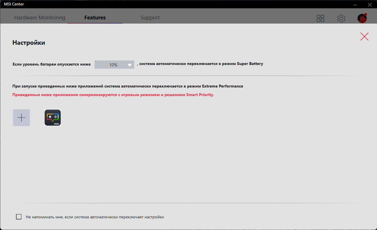 MSI Center — наиболее важный и практически полезный программный пакет. Он загружается в память резидентно при старте Windows и обнаруживается в системном «выдвижном ящике» панели задач. В окне приложения имеются три вкладки слева и три пиктограммы справа.