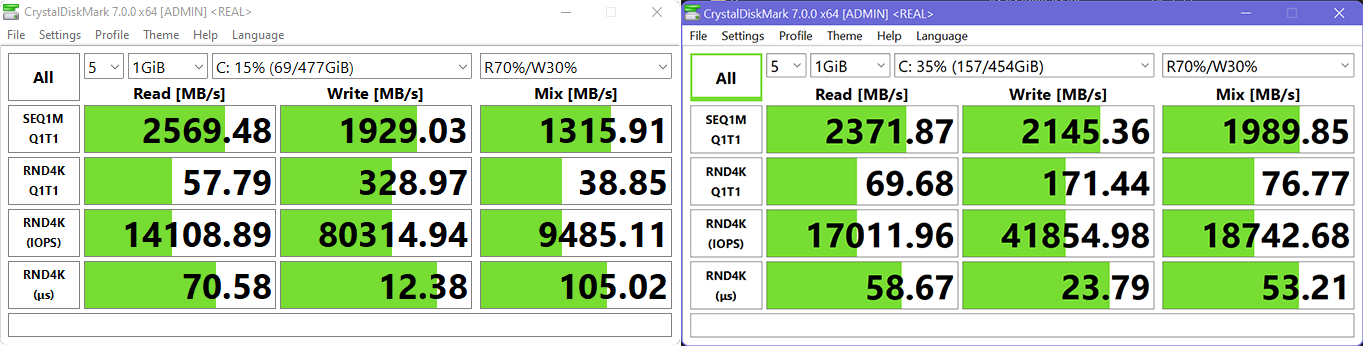 справа результаты SK Hynix HFM512GD3JX013N (512 ГБ) в Asus TUF Gaming F15 FX507ZM