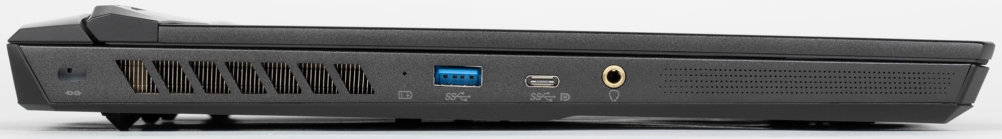 На левой боковой панели помещена решетка выходного отверстия системы охлаждения, слева от нее — отверстие кенсингтонского замка, справа — индикатор зарядки батареи, порты USB3 Type A и USB3 Type С (с поддержкой вывода видео) и стандартный миниджек 3,5 мм для подключения аудиогарнитуры.