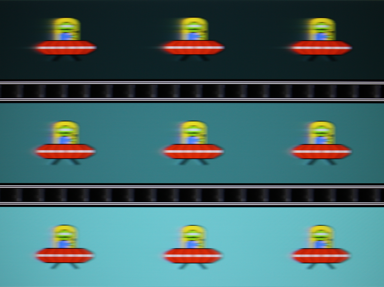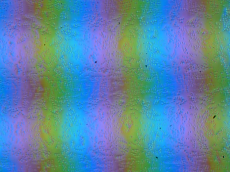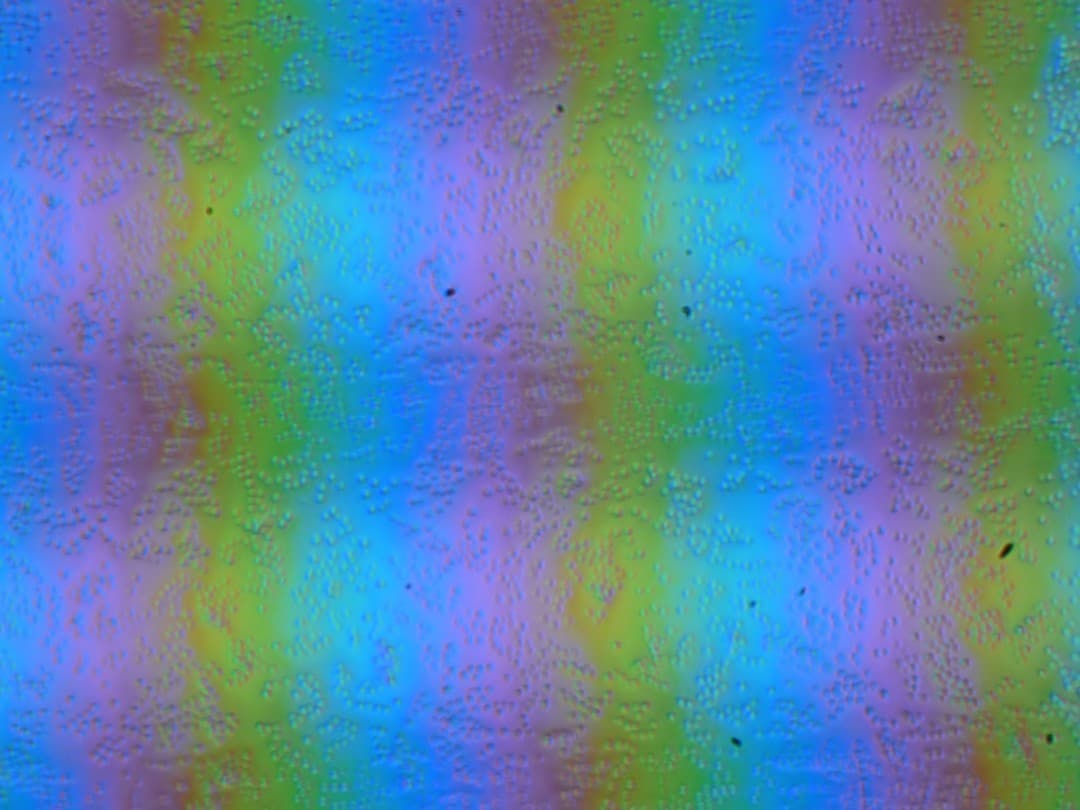 Зерно этих дефектов в несколько раз меньше размеров субпикселей (масштаб этих двух фотографий примерно одинаковый), поэтому фокусировка на микродефектах и «перескок» фокуса по субпикселям при изменении угла зрения выражены слабо, из-за этого нет и «кристаллического» эффекта.