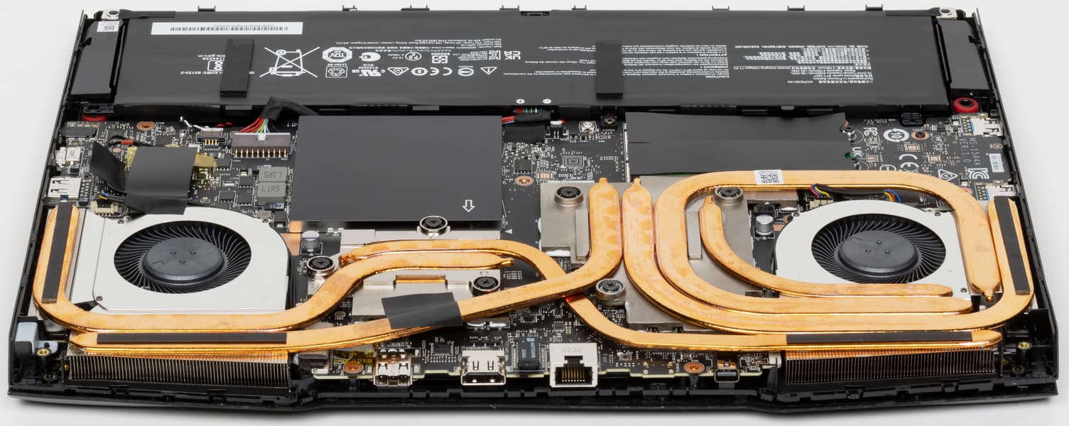 Правда, если все-таки говорить о профессиональном применении, то недостатки в конфигурации ноутбука найти можно — скажем, цветовой охват экрана заужен по сравнению с sRGB. Но в целом всё прекрасно, из особенностей можно выделить 2,5-гигабитный адаптер Ethernet, разумный набор портов с несколькими вариантами видеовыходов, возможность апгрейда ОЗУ (2 слота) и системы хранения данных (тоже 2 слота). Система охлаждения справляется со своей работой, хотя в производительных режимах шум все-таки высокий (это неизбежно для серьезных игровых моделей). Возможности автономной работы скромные (это тоже типично для игровых ноутбуков).