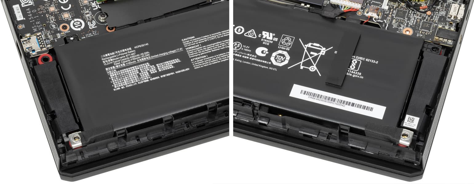 Сняв нижнюю крышку, получаем доступ к системе охлаждения, модулям оперативной памяти, твердотельным накопителям и аккумулятору. Единственное «но»: один из винтов заклеен заводским стикером, и нарушение его целостности может осложнить выполнение производителем гарантийных обязательств. Если забыть об этом, то можно увеличить доступный объем оперативной памяти (скажем, установить 32 ГБ в двух модулях по 16 ГБ), заменить твердотельный накопитель в первом слоте M.2 или добавить еще один во второй слот. Чуть больше времени потребует замена батареи. Последняя, разумеется, крепится к корпусу винтами, но обладает собственным разъемом, поэтому извлекается и устанавливается без особых хлопот.