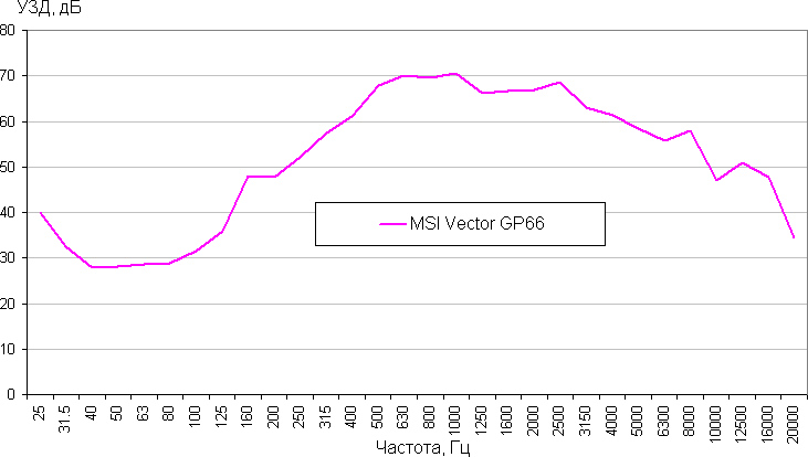 Если ноутбук не нагружать совсем, то его система охлаждения даже в случае профиля Super Battery все равно не может работать в пассивном режиме, но уровень шума при этом очень низкий. В случае большой нагрузки на процессор и/или видеокарту шум от системы охлаждения зависит от выбранного профиля. Характер шума ровный и раздражения не вызывает. Спектрограмма, полученная для профиля Extreme Performance под максимальной нагрузкой, достаточно ровная, и в диапазоне частот, где звуки могут вызывать особенное раздражение, выраженных пиков нет (низкочастотными пиками можно пренебречь):