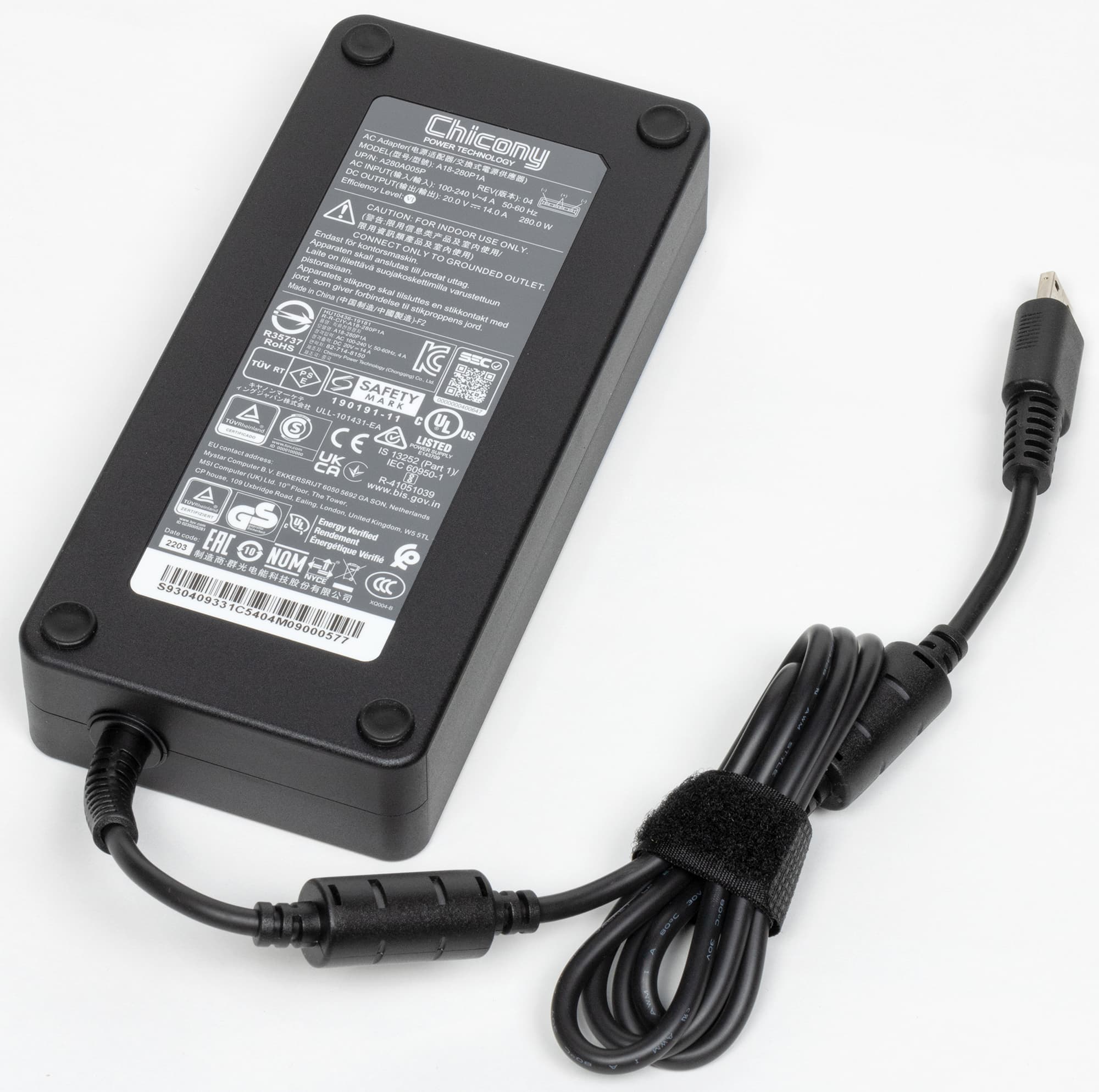 Помимо самой машины в комплекте поставки обнаруживается весьма тяжелый (872 г) и крупный адаптер питания, который обеспечивает на выходе 20 В при силе тока 14 А (мощность 280 Вт).