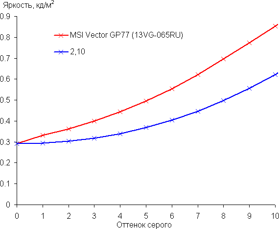 Внешняя поверхность матрицы черная жесткая и полуматовая (зеркальность очень хорошо выражена). Какие-либо специальные антибликовые покрытия или фильтр отсутствуют, нет и воздушного промежутка. При питании от сети или от батареи и при ручном управлении яркостью (автоматической подстройки по датчику освещенности нет) ее максимальное значение составило 300 кд/м² (в центре экрана на белом фоне). Максимальная яркость довольно высокая, поэтому за ноутбуком как-то можно будет работать/играть на улице ясным днем, если расположиться в тени.