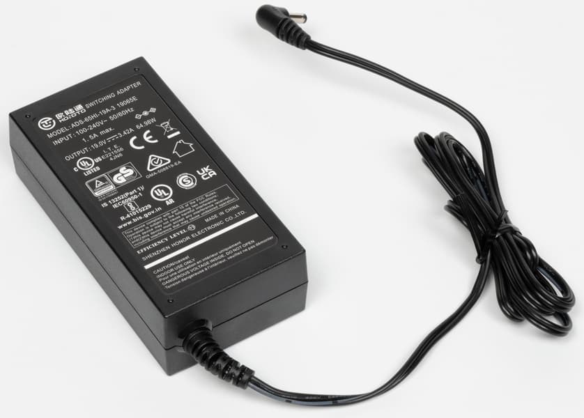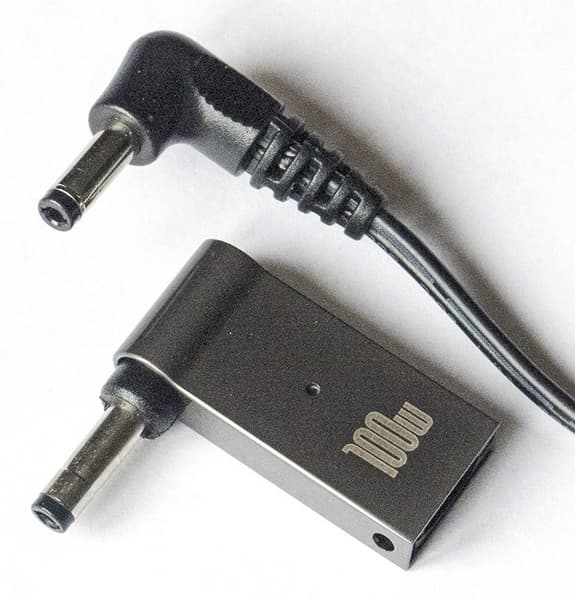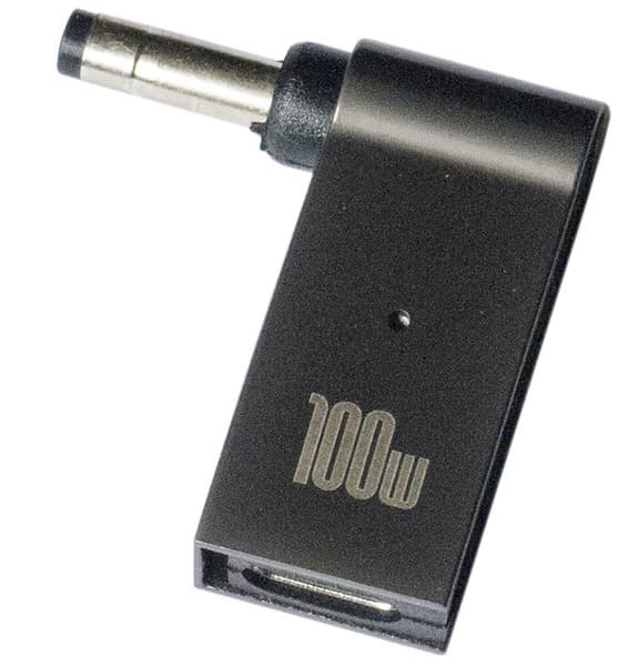 Внутри такого адаптера имеется чип, устанавливающий на выходе подключенного PD-источника режим 20V@3.25A (65 Вт) или 20V@5A (100 Вт). В нашем случае использовался 100-ваттный переходник с выходным цилиндрическим коннектором 4,0×1,7 мм, как в штатном блоке питания Ninkear N16 Pro, с его помощью мы подключились к источнику PD 20V@5A.