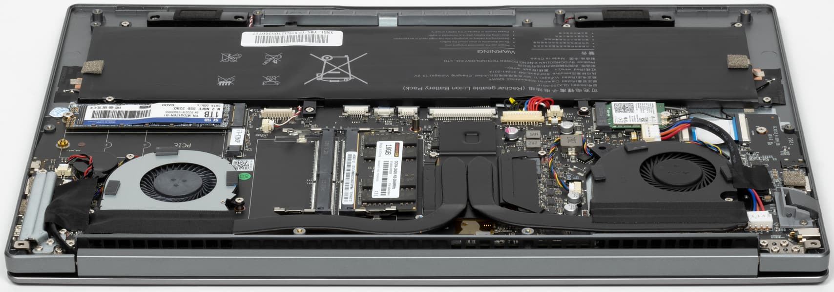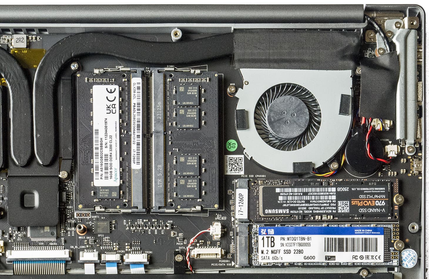 Сейчас он поставляется в двух конфигурациях: с ОЗУ 16 ГБ / SSD 1 ТБ, а также с ОЗУ 32 ГБ / SSD 2 ТБ (в интернете можно найти упоминания и варианта 16 ГБ / 512 ГБ — возможно, такое предлагалось ранее). При этом для модулей памяти есть два слота SO-DIMM, для накопителей — два слота М.2.