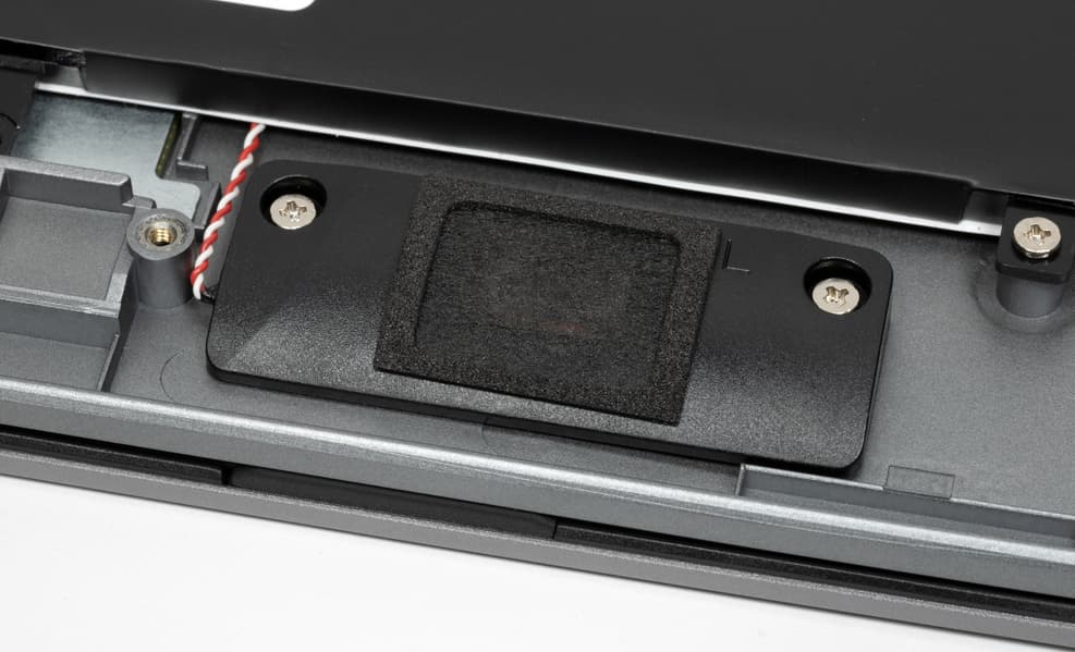 На днище, кроме протянувшихся почти по всей ширине ножек (передняя немного короче), ближе к задней кромке имеется вентиляционная решетка, через которую происходит забор воздуха для охлаждения компонентов, поэтому ставить ноутбук на мягкую поверхность не следует.