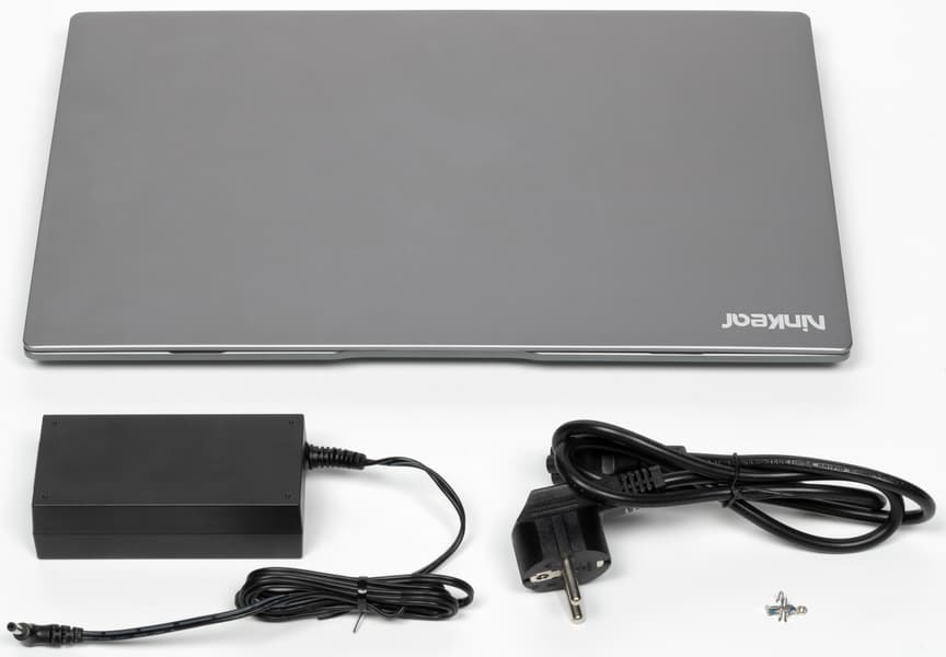 В комплекте, кроме самого ноутбука, имеется адаптер питания со сменным входным кабелем длиной 0,9 м и распаянным выходным длиной 1,45 м (коннектор 4,0×1,7 мм), а также пакетик с крепежом — несколько крошечных винтов: с широкой шляпкой для крепления второго SSD плюс запасные для нижней крышки.