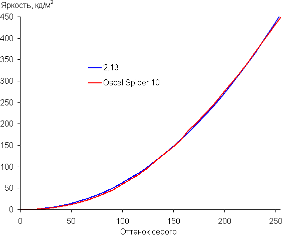 Построенная по 32 точкам с равным интервалом по численному значению оттенка серого гамма-кривая не выявила завала ни в светах, ни в тенях. Показатель аппроксимирующей степенной функции равен 2,13, что немного ниже стандартного значения 2,2. При этом реальная гамма-кривая слегка отклоняется от степенной зависимости: