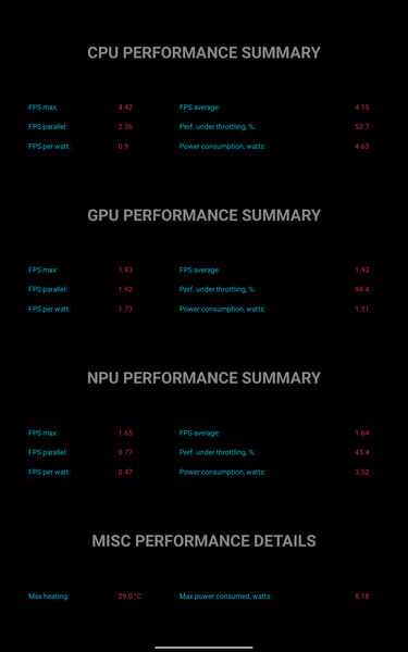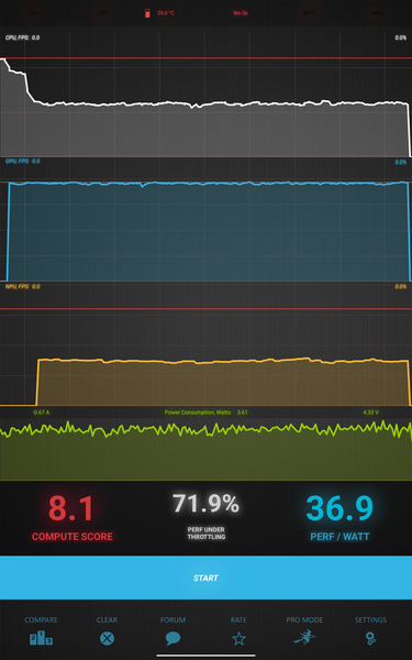 При длительном интенсивном использовании падение производительности GPU практически нулевое, а CPU тротлится изрядно. Ниже отчет программы Burnout Benchmark.