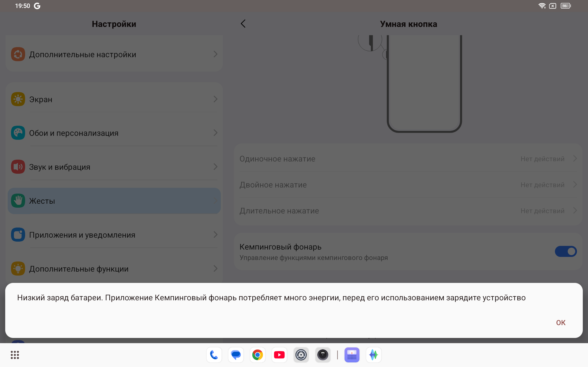 Там надо активировать рычажок «Кемпинговый фонарь». Тогда по умолчанию кнопка будет управлять именно им. При этом, сразу мы видим предупреждение, что фонарь потребляет много энергии. Забавно, что это сообщение, да еще с восклицанием «Низкий заряд батареи!» появляется в любом случае, вне зависимости от реального уровня заряда (на скриншоте ниже видно, что батарея практически полностью заряжена).