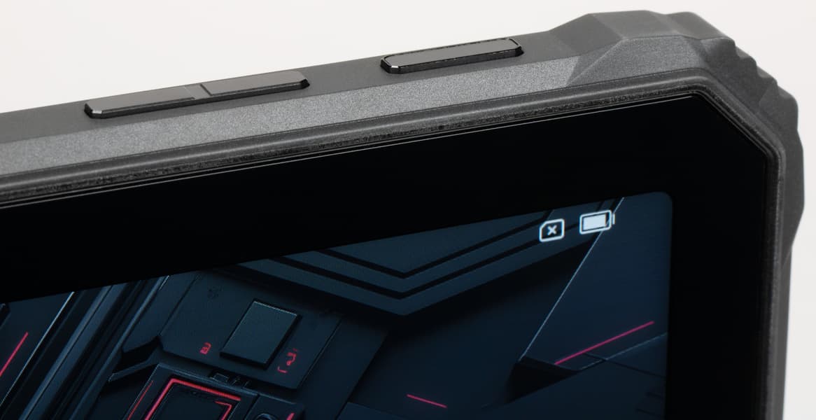 Обратим внимание также на четыре отверстия для винтов. Они нужны как раз для закрепления наручного ремня (об этом мы рассказывали в описании комплектации). Ну а по краям устройство полностью защищено окантовкой из прорезиненного пластика. Это должно спасти планшет практически при любом падении, так как удар придется на окантовку даже при падении экраном плашмя. На фото ниже видно, что рамка немного выступает над уровнем стекла.