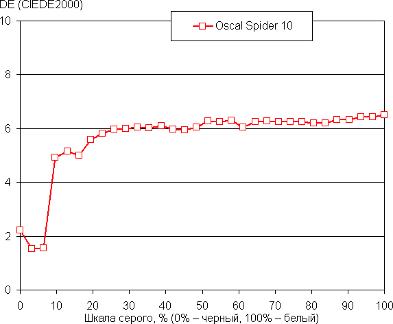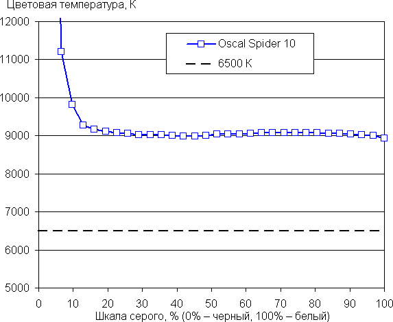 Баланс оттенков на шкале серого средний, так как цветовая температура существенно выше стандартных 6500 К, но хотя бы отклонение от спектра абсолютно черного тела (ΔE) ниже 10 единиц, что для потребительского устройства считается приемлемым показателем. При этом цветовая температура и ΔE мало изменяются от оттенка к оттенку — это положительно сказывается на визуальной оценке цветового баланса. (Самые темные области шкалы серого можно не учитывать, так как там баланс цветов не имеет большого значения, да и погрешность измерений цветовых характеристик на низкой яркости большая.)