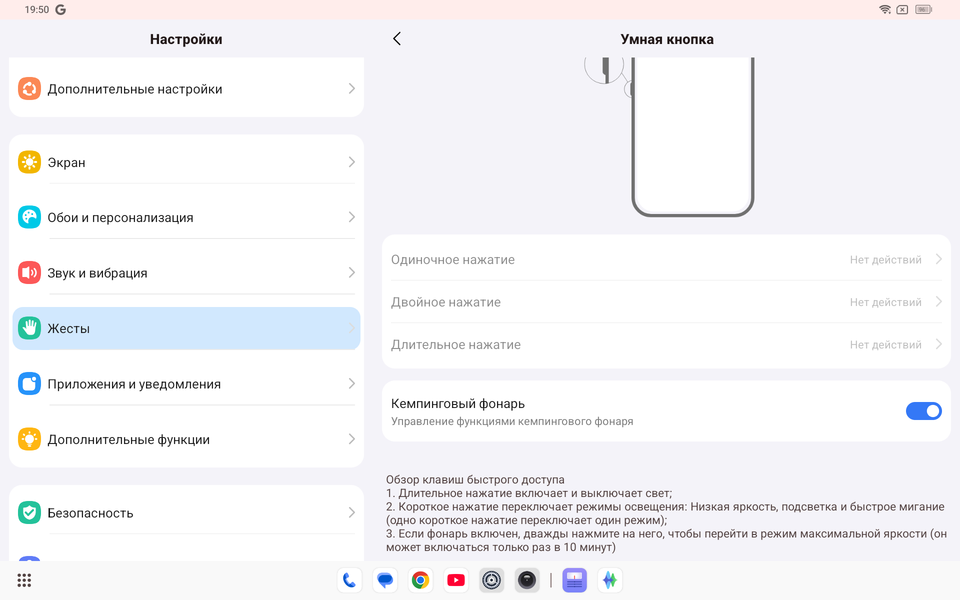 Облик задней поверхности формируют несколько элементов. Во-первых, металлическая крышка темно-коричневатого оттенка. Во-вторых, две ярко-желтые вставки. Они здесь не только для украшения: на самом деле это кемпинговый фонарь. Он светит достаточно ярко и мощно, чтобы осветить, например, пространство внутри палатки или подвал небольшого дома. Правда, чтобы включить его, надо проделать весьма неочевидные манипуляции. В настройках устройства надо зайти в раздел «Жесты» (почему-то), и там будут опции управления вспомогательной кнопкой (о ней речь пойдет далее).