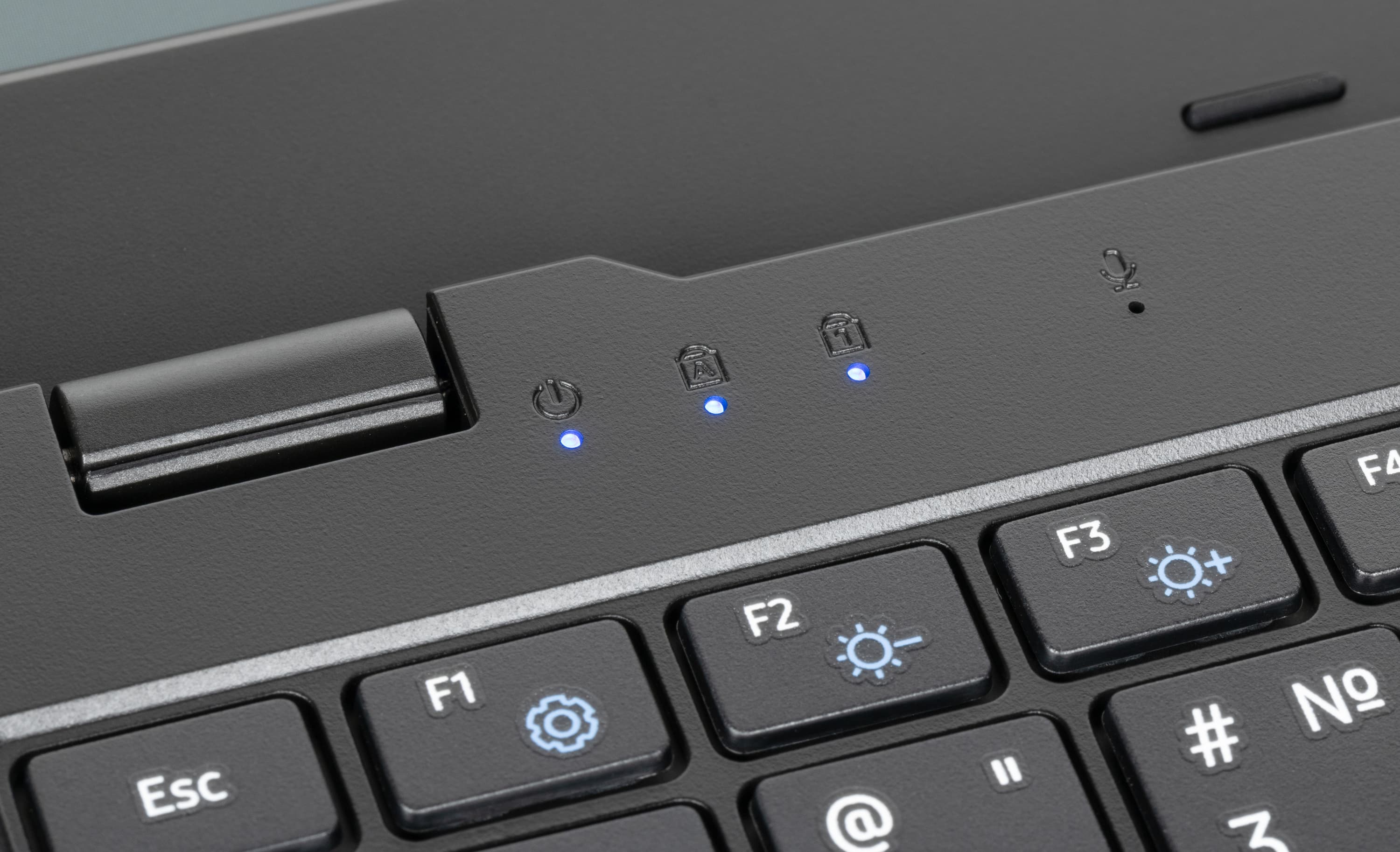 За клавиатурой слева находятся крошечные светодиодные индикаторы включения и режимов Caps Lock, Num Lock. Там же, но чуть правее, расположены отверстия микрофонов.