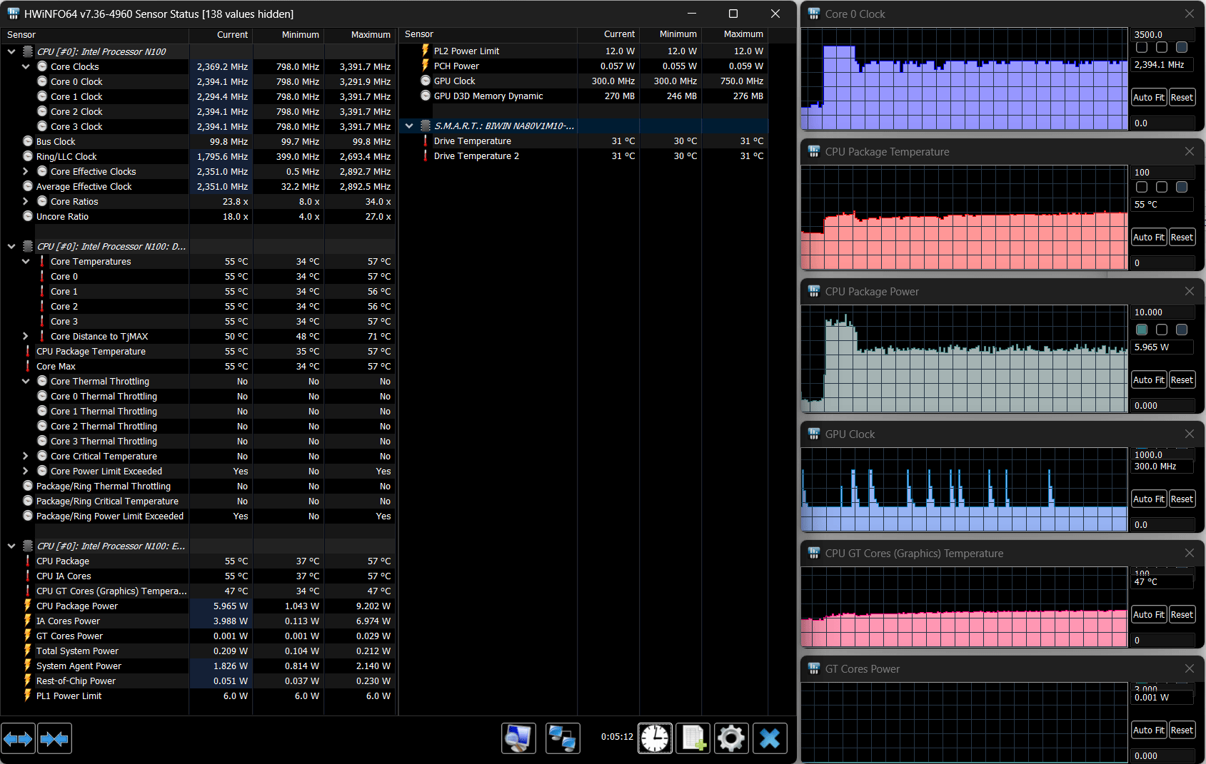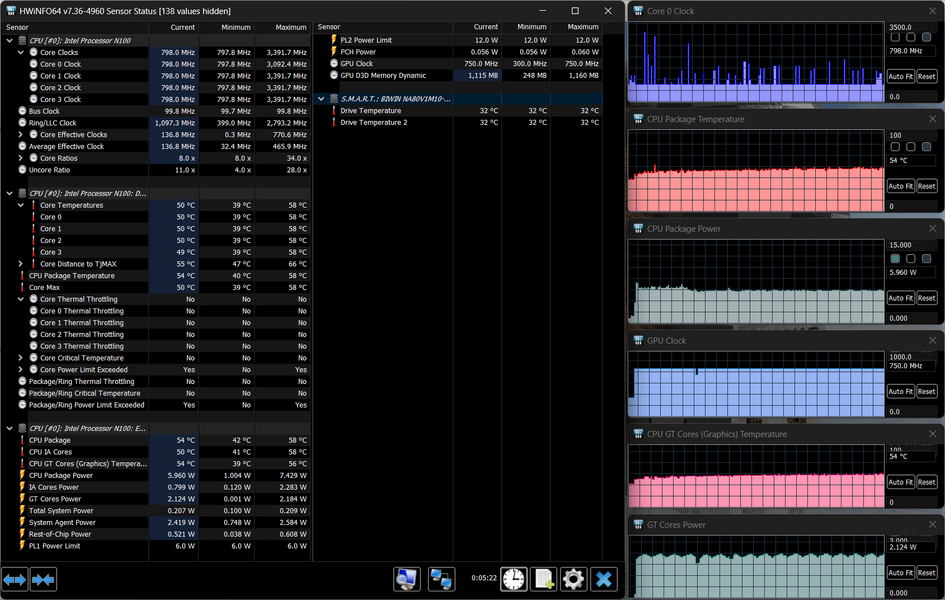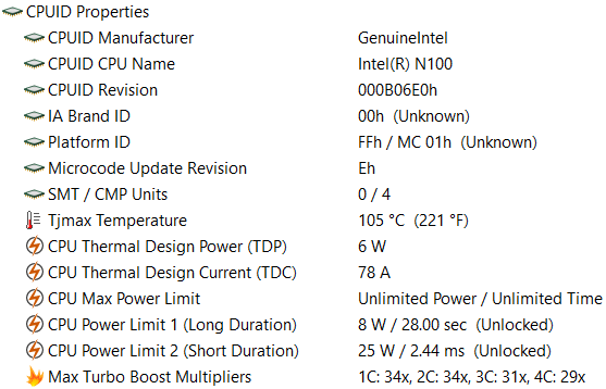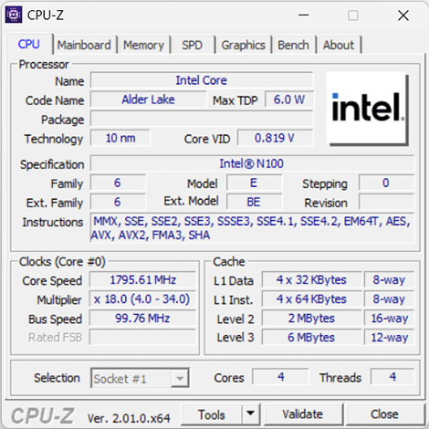 В ноутбуке установлен процессор Intel N100 (кодовое наименование Alder Lake-N, выпускается с начала 2023 года). У него четыре однопоточных энергоэффективных ядра, которые могут работать на частотах до 3,4 ГГц.