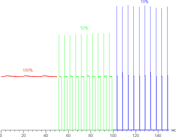 Управление яркостью подсветки осуществляется с помощью ШИМ с частотой 200 Гц. В доказательство приведем графики зависимости яркости (вертикальная ось) от времени (горизонтальная ось) при различных значениях настройки яркости: