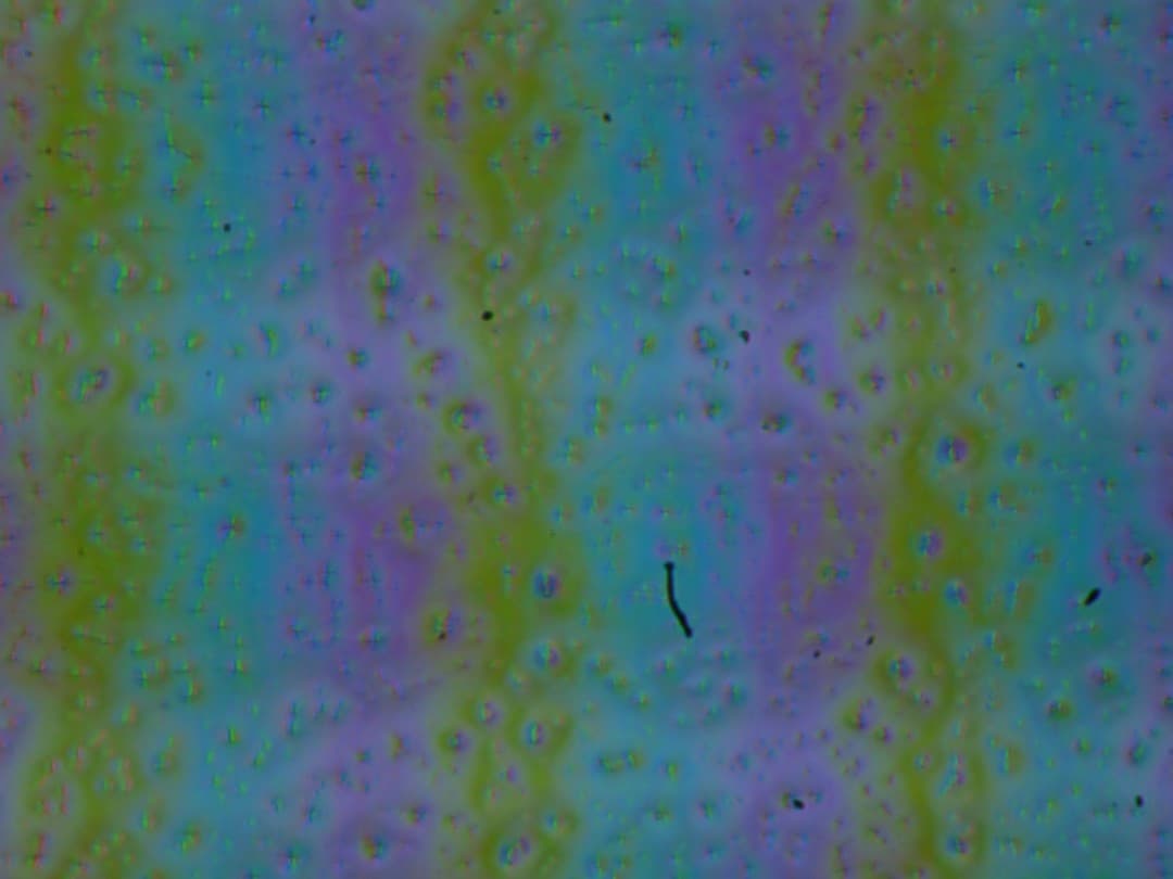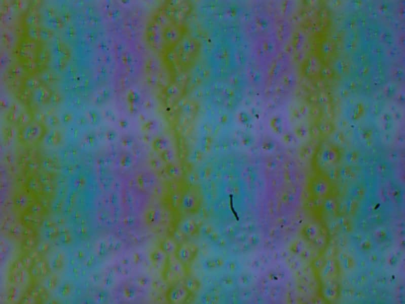 Зерно этих дефектов в несколько раз меньше размеров субпикселей (масштаб этих двух фотографий примерно одинаковый), поэтому фокусировка на микродефектах и «перескок» фокуса по субпикселям при изменении угла зрения выражены слабо, из-за этого нет и «кристаллического» эффекта.