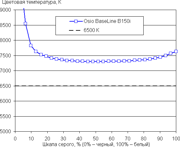 Баланс оттенков на шкале серого средний, так как цветовая температура не сильно выше стандартных 6500 К, но отклонение от спектра абсолютно черного тела (ΔE) выше 10 для большинства оттенков серого, что даже для потребительского устройства считается не очень хорошим показателем. Однако при этом цветовая температура и ΔE мало изменяются от оттенка к оттенку — это положительно сказывается на визуальной оценке цветового баланса. (Самые темные области шкалы серого можно не учитывать, так как там баланс цветов не имеет большого значения, да и погрешность измерений цветовых характеристик на низкой яркости большая.)