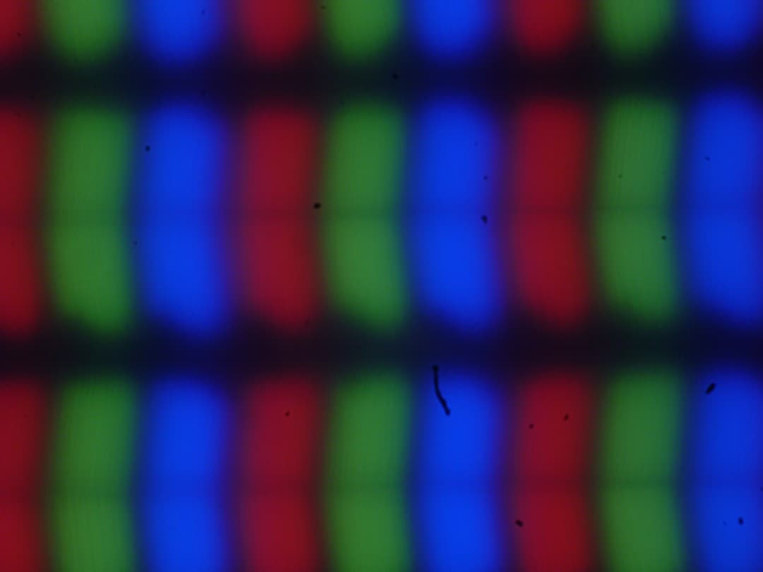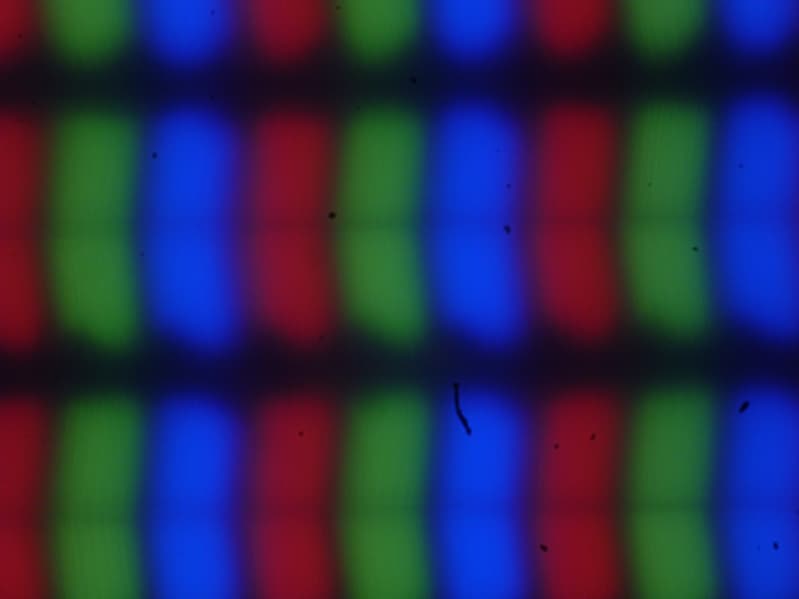 В этом ноутбуке используется матрица типа IPS. Микрофотографии демонстрируют типичную для IPS структуру субпикселей (черные точки — это пыль на матрице фотоаппарата):