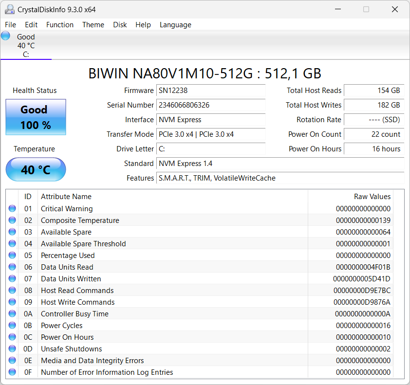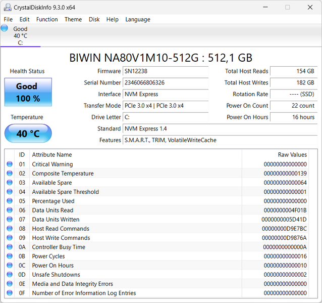 Установленный накопитель Biwin NA80V1M10-512G (M.2 2280, NVMe, PCIe 3.0 x4) на 512 ГБ имеет среднюю производительность.