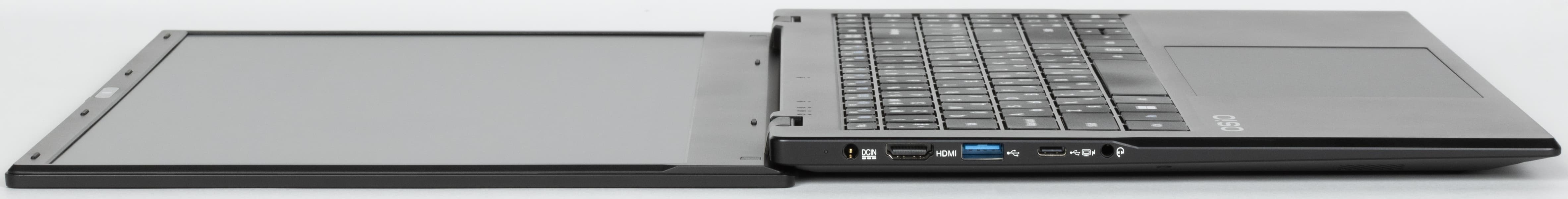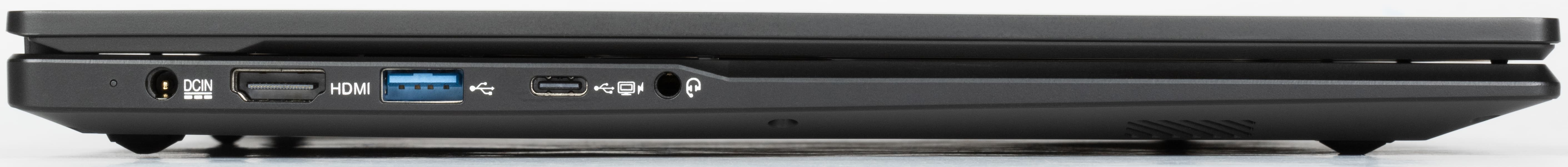 Слева находятся гнездо питания с индикатором, порты HDMI (полноразмерный), два USB 3.2 Gen1 — Type-A и Type-С (этот разъем помечен символами монитора и молнии, то есть может использоваться для вывода видеосигнала и для питания от источника, поддерживающего Power Delivery, о чем в официальных источниках не сказано), а также комбинированный миниджек для аудиогарнитуры.
