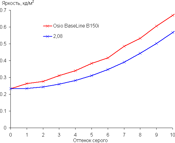 Рост прироста яркости на большей части шкалы серого более-менее равномерный, и каждый следующий оттенок ярче предыдущего, за исключением пары самых светлых оттенков, которые по яркости от белого не отличаются. В самой темной области аппаратно и визуально хорошо различаются все оттенки: