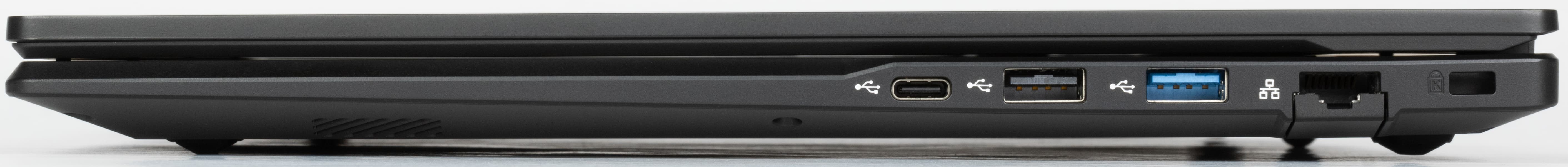 На правом боку имеются отверстие кенсингтонского замка, разъем Ethernet с откидной крышечкой, порты USB 3.2 Gen1 Type-A и два USB 2.0 — Type-A и Type-С (выбор стандарта для правого порта USB-C странный, но такое в недорогих ноутбуках уже встречалось).