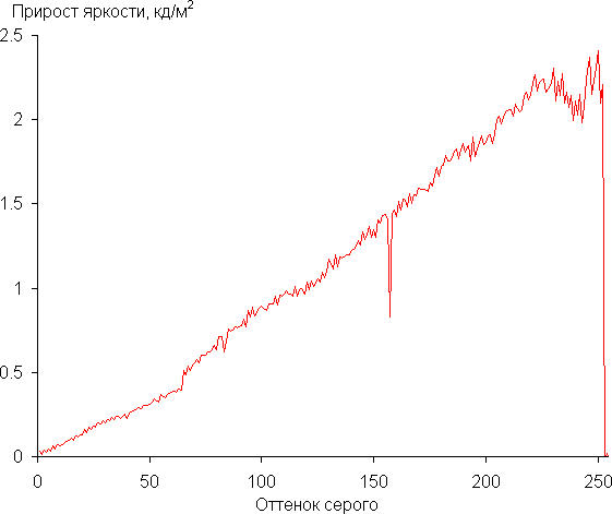 Далее мы измерили яркость 256 оттенков серого (от 0, 0, 0 до 255, 255, 255). График ниже показывает прирост (не абсолютное значение!) яркости между соседними полутонами: