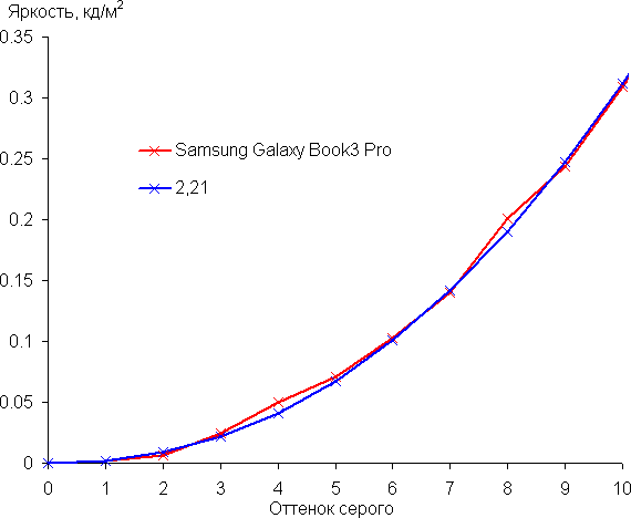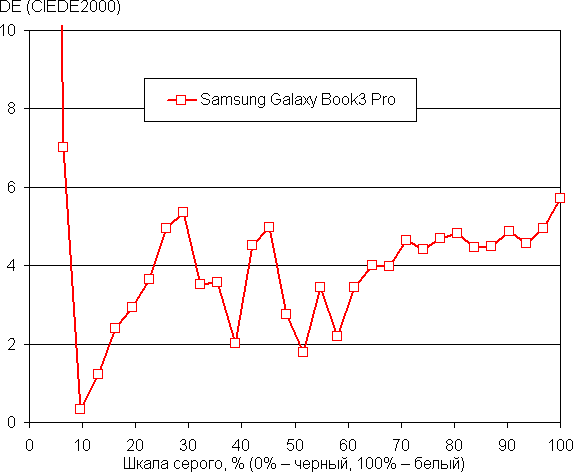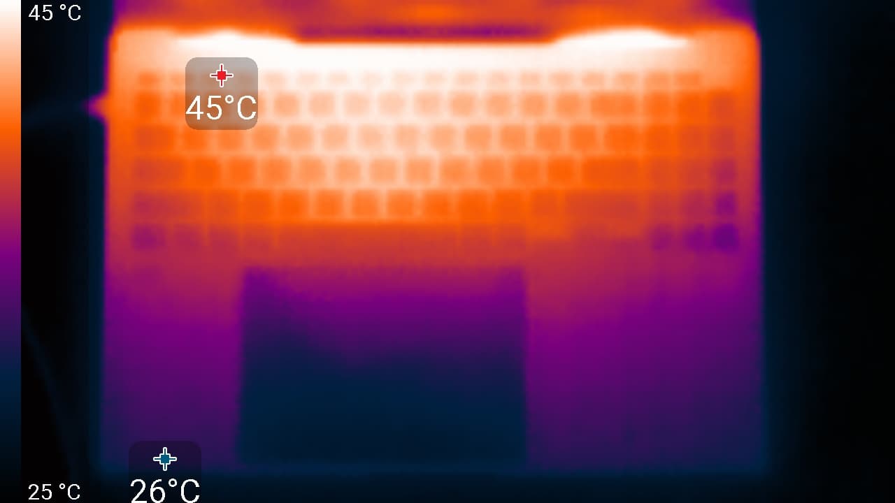 При питании от сети или от батареи и при ручном управлении яркостью ее максимальное значение в режиме SDR составило порядка 400 кд/м² (в центре экрана на белом фоне во весь экран). Максимальная яркость довольно высокая. Если избегать прямого солнечного света, то даже такое значение позволит с относительным комфортом использовать ноутбук на улице летним солнечным днем.