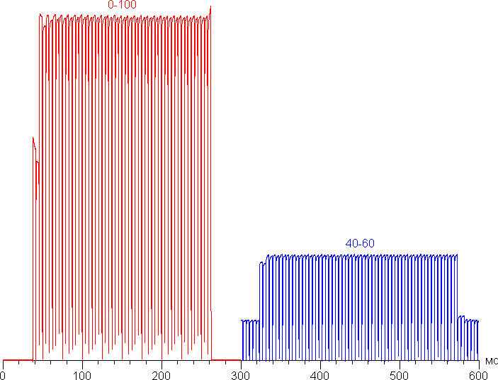 Переключение состояния элементов матрицы OLED выполняется практически мгновенно (порядка 0,2 мс для одного перехода), но на фронте включения и реже выключения может присутствовать ступенька шириной примерно 17 мс (что соответствует частоте обновления экрана в 60 Гц) или шириной примерно 8 мс (120 Гц) . Например, так выглядит зависимость яркости от времени при переходе от черного к белому (график 0—100) и от серого к серому (40%—60% по численному значению оттенка — график 40—60) и обратно: