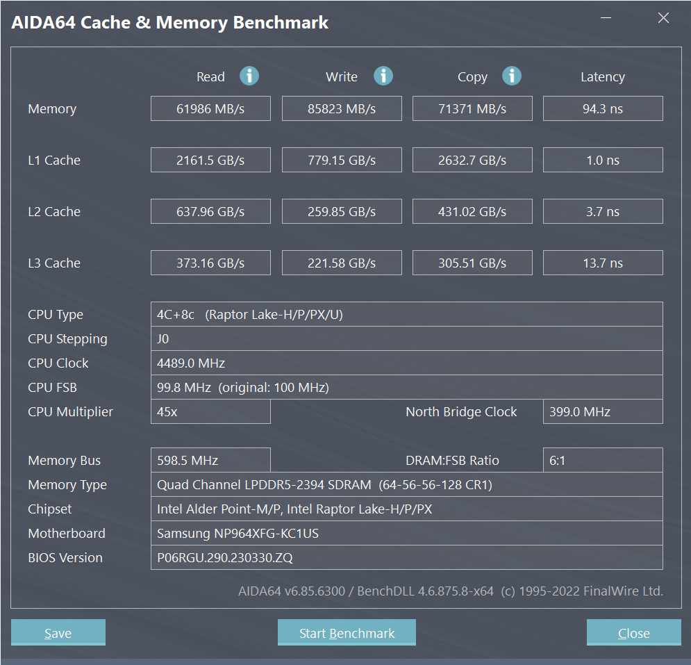Машина располагает 32 ГБ оперативной памяти LPDDR5, микросхемы которой, как и процессор, распаяны на плате. Слотов для установки дополнительных модулей нет, что исключает возможность замены и апгрейда ОЗУ. Проведем ее проверку на быстродействие при помощи встроенного бенчмарка утилиты Aida64 в высокопроизводительном (High Performance) и оптимизированном (Optimized) режимах в соответствии с установками фирменной утилиты Samsung Settings.