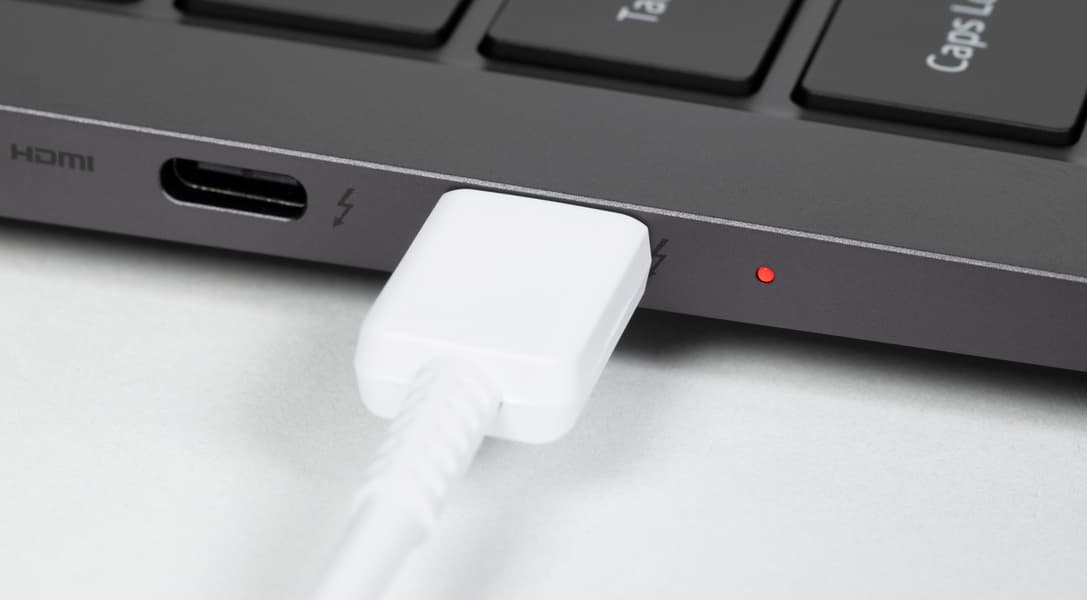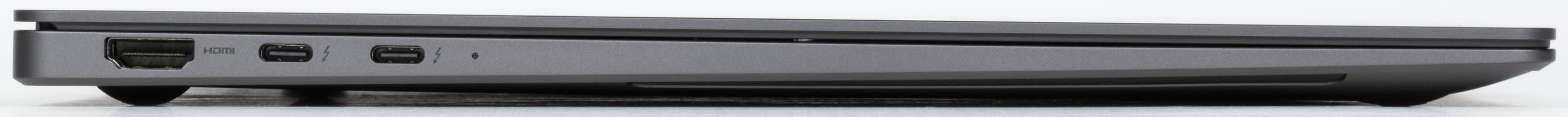 Слева помещаются стандартный видеовыход HDMI и два порта Thunderbolt 4. Оба обладают обратной совместимостью с USB 3, поддерживают вывод видео по DisplayPort и питание внешних устройств (PowerDelivery). Для зарядки машины можно использовать любой из этих двух разъемов. О подключении адаптера питания уведомляет светодиодный индикатор.