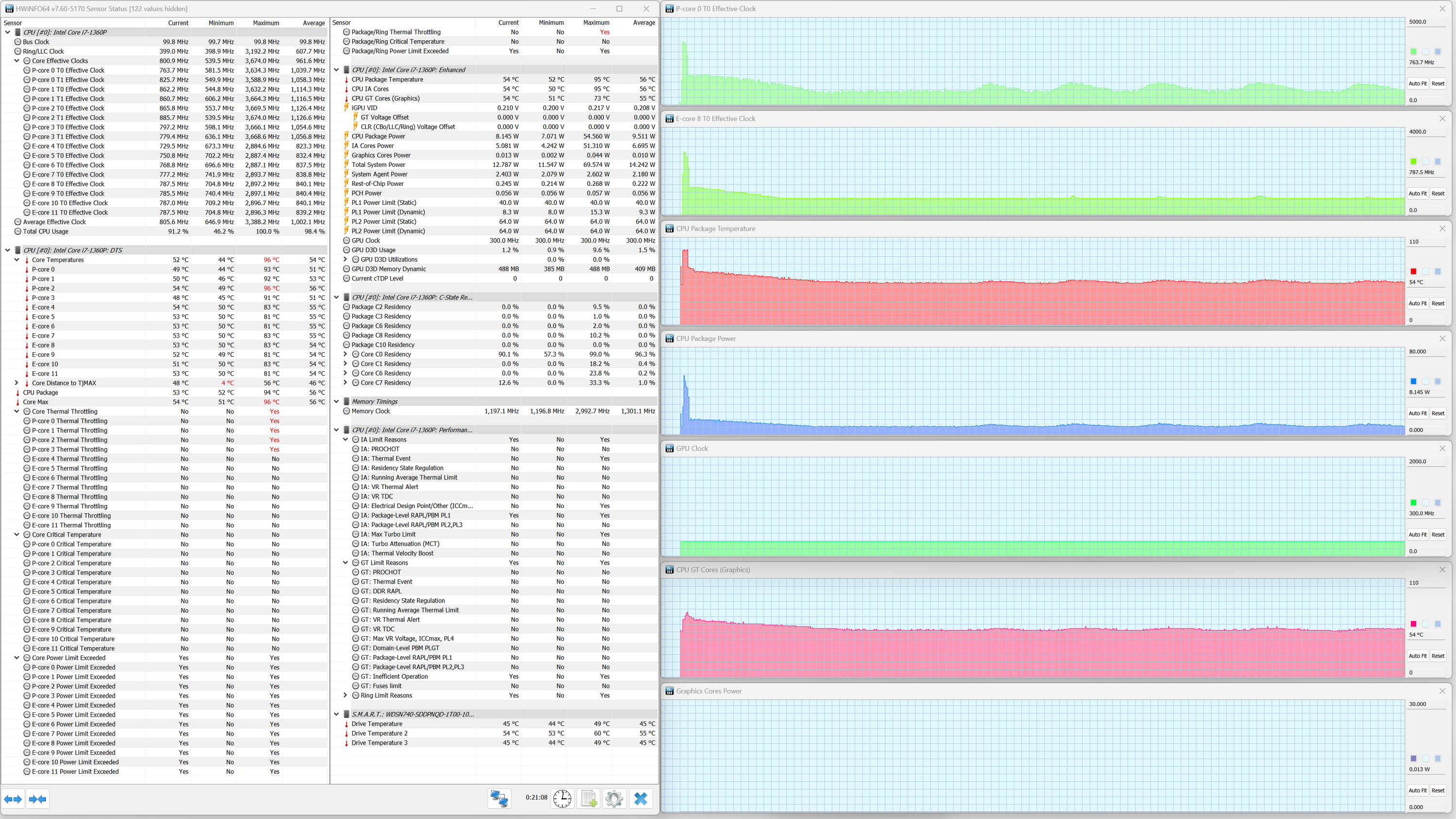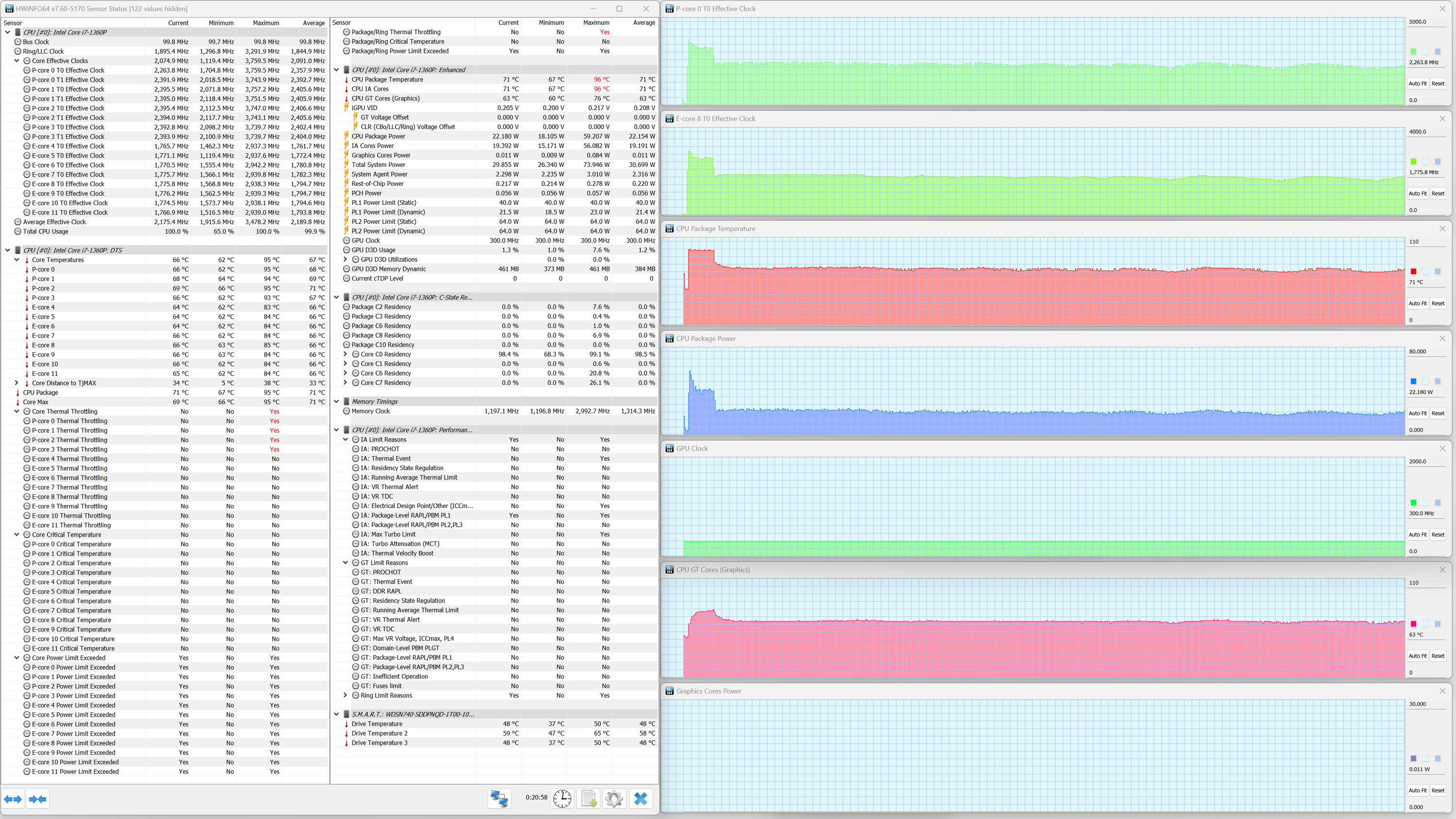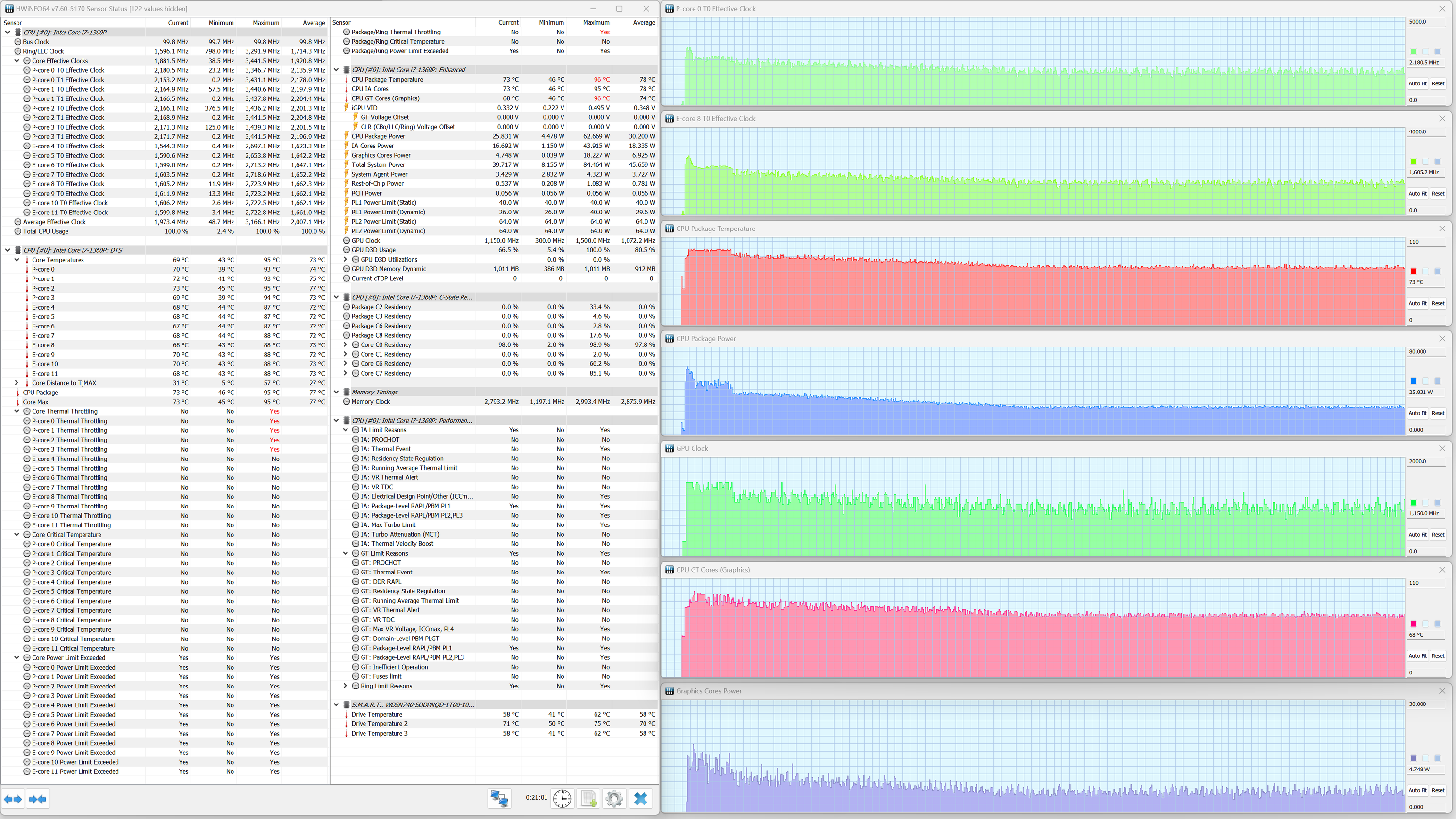 В ноутбуке Samsung Galaxy Book3 Pro установлен мобильный процессор Intel Core i7-1360P. В соответствии с термопакетом, его тепловыделение в стабильном режиме составляет до 28 Вт, а при разгоне — до 64 Вт. Энергоэффективные ядра (E) могут, согласно паспорту, разгоняться до 3,7 ГГц, а высокопроизводительные (P) — до 5 ГГц. Верхняя граница нагрева процессора составляет 100 °C. В ходе испытаний CPU отбирал в пике до 64 Вт, что чуть ниже паспортного значения, а при стабильной работе — до 34 Вт.