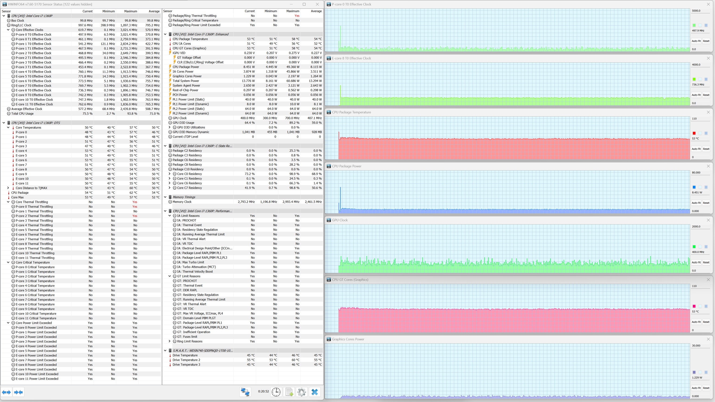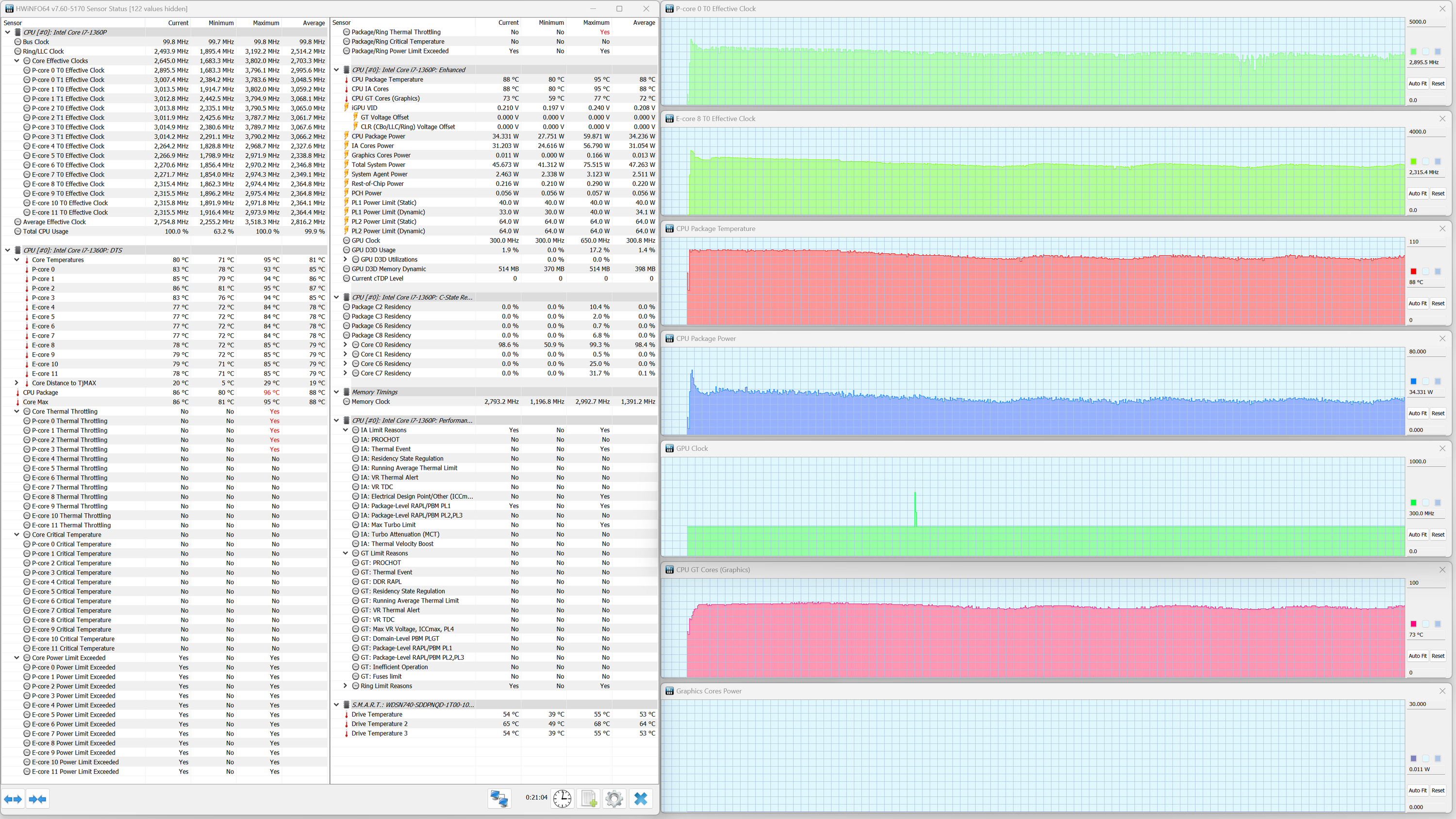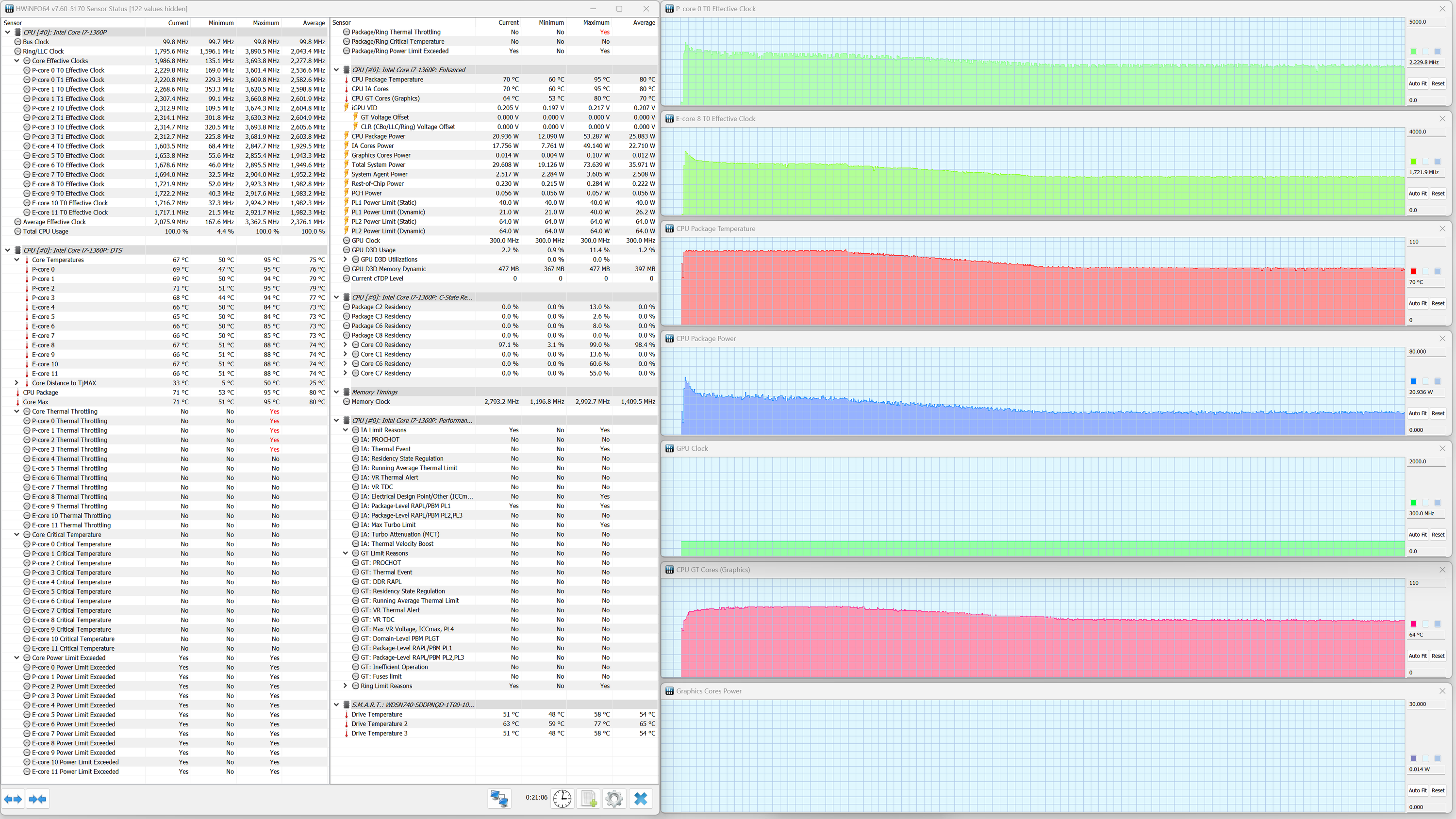 В ноутбуке Samsung Galaxy Book3 Pro установлен мобильный процессор Intel Core i7-1360P. В соответствии с термопакетом, его тепловыделение в стабильном режиме составляет до 28 Вт, а при разгоне — до 64 Вт. Энергоэффективные ядра (E) могут, согласно паспорту, разгоняться до 3,7 ГГц, а высокопроизводительные (P) — до 5 ГГц. Верхняя граница нагрева процессора составляет 100 °C. В ходе испытаний CPU отбирал в пике до 64 Вт, что чуть ниже паспортного значения, а при стабильной работе — до 34 Вт.