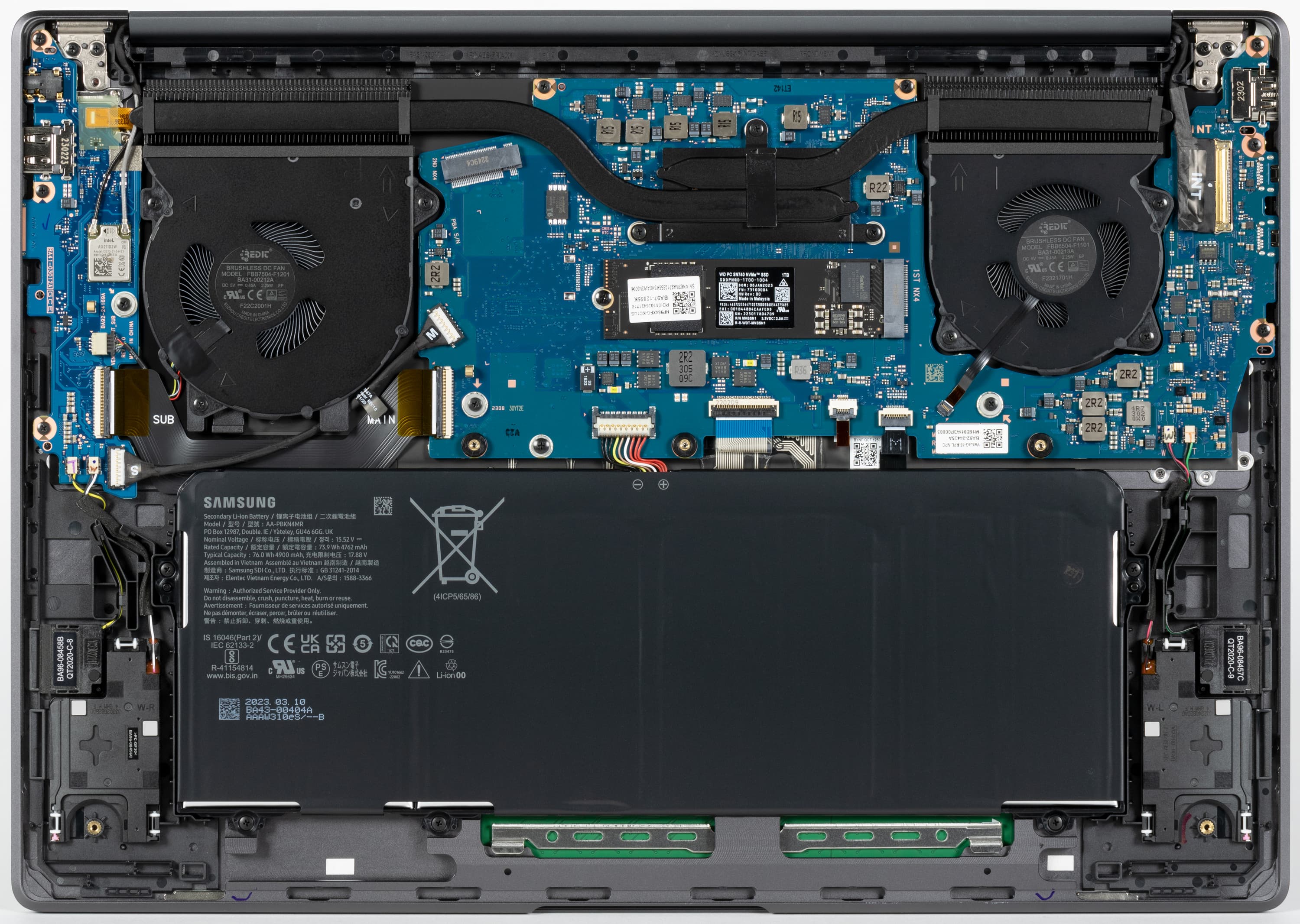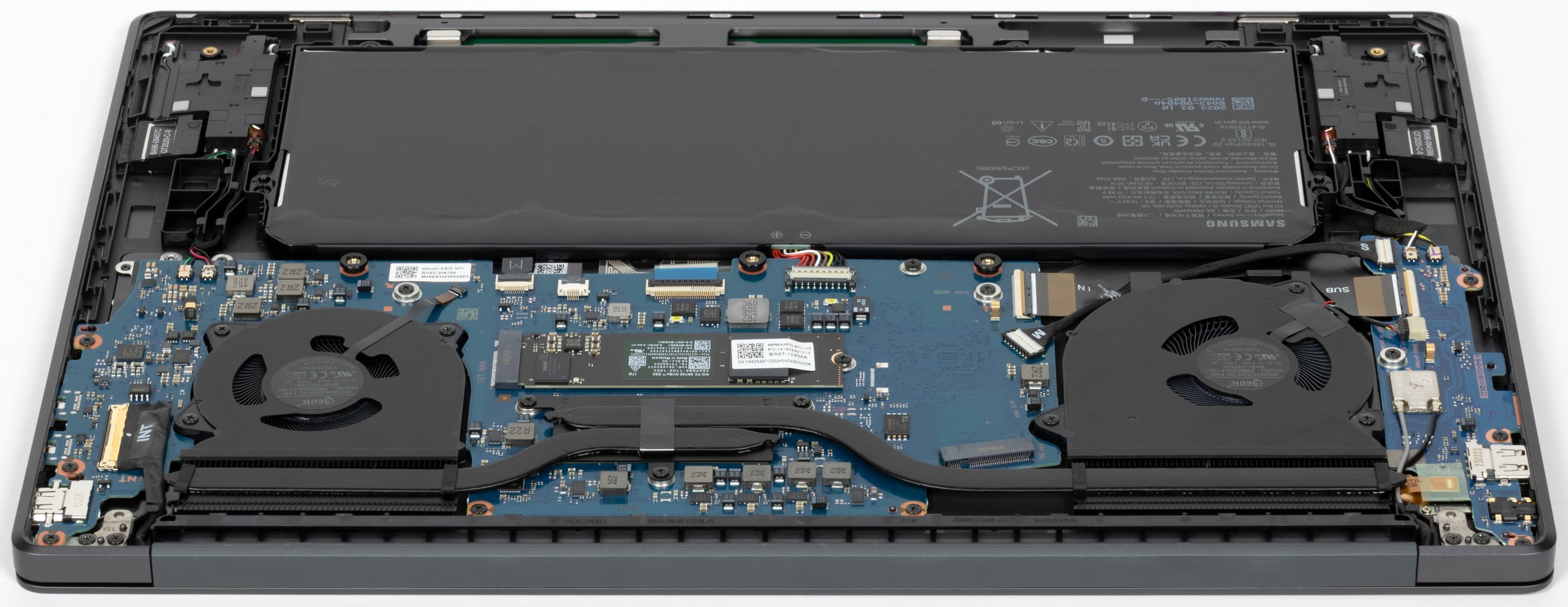 Внутри корпуса обращают на себя внимание системная плата, система охлаждения, аккумулятор и суппорты громкоговорителей. Плата с разрезным конструктивом, двухкомпонентная. Помимо главной части имеется правый сателлит (на фото он расположен слева) с беспроводным адаптером, картоводом, портом USB, комбинированным аудиоразъемом и т. д. С главной частью он соединенен шлейфом (Sub—Main) и кабелем питания в двойной оплетке (S—M).
