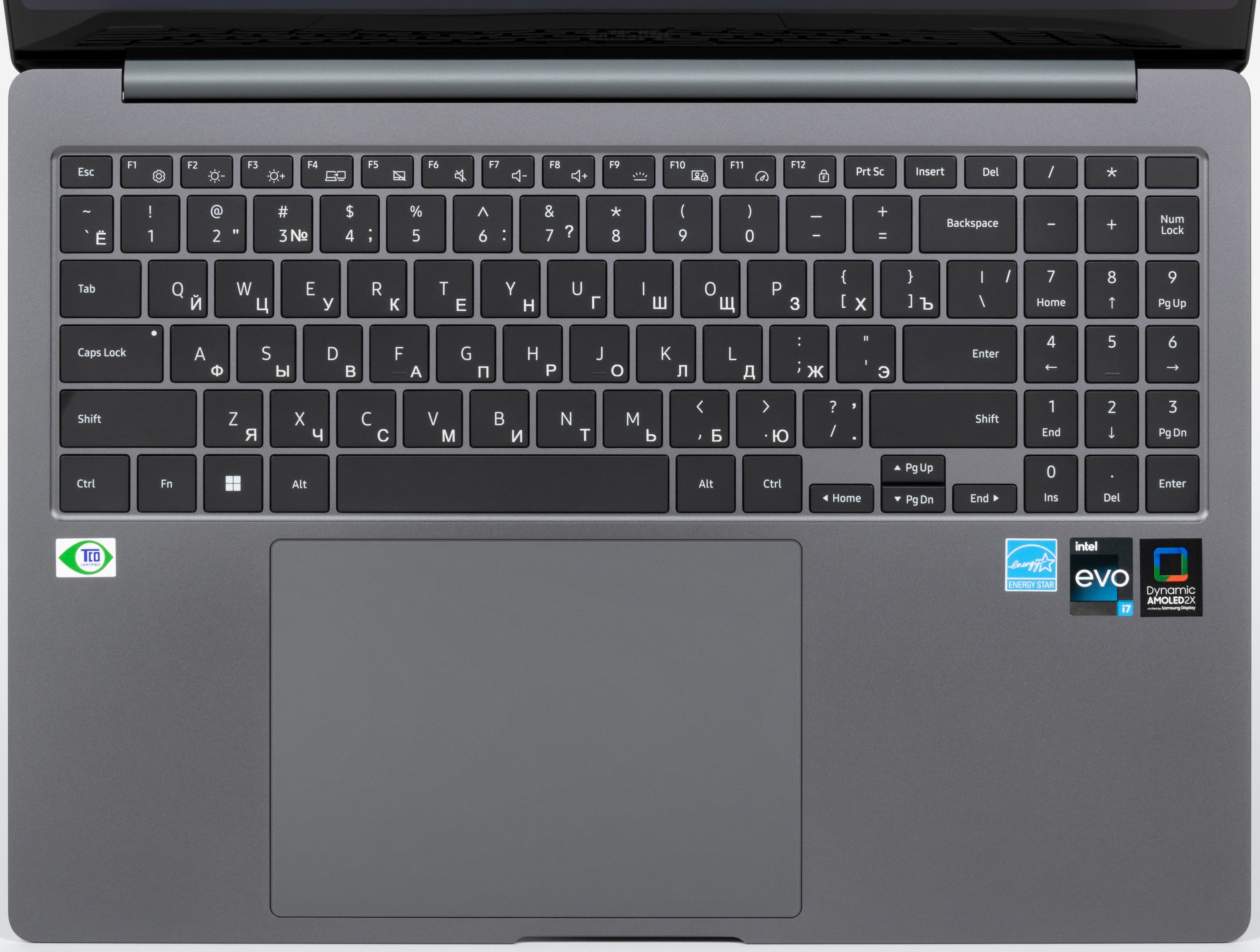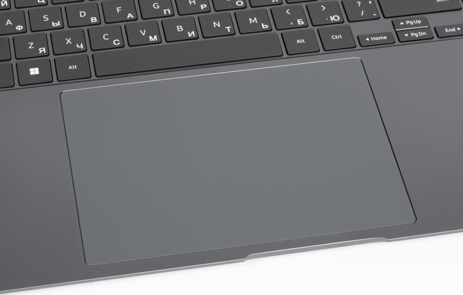 Перед клавиатурой помещается увеличенный по площади, чуть утопленный кликпад размером 140×90 мм без выделенных кнопок. Как подчеркивает производитель, его площадь на 24% больше, чем у 14-дюймового Galaxy Book3 Pro и на 39% больше, чем у равновеликого собрата Galaxy Book3 Pro прежнего поколения. Дальняя от пользователя часть сенсорной площадки на нажатия реагирует плохо, их лучше совершать в ближних ⅔, где четкость срабатывания хорошая. С жестами, подразумевающими касание поверхности, никаких проблем не возникает.