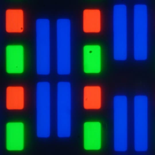 В данном экране используется матрица типа AMOLED — активная матрица на органических светодиодах. Полноцветное изображение создается с помощью субпикселей трех цветов — красного (R), зеленого (G) и синего (B) в равном количестве — по три разного вида на пиксель. Это подтверждается фрагментом микрофотографии (синий субпиксель сдвоенный):