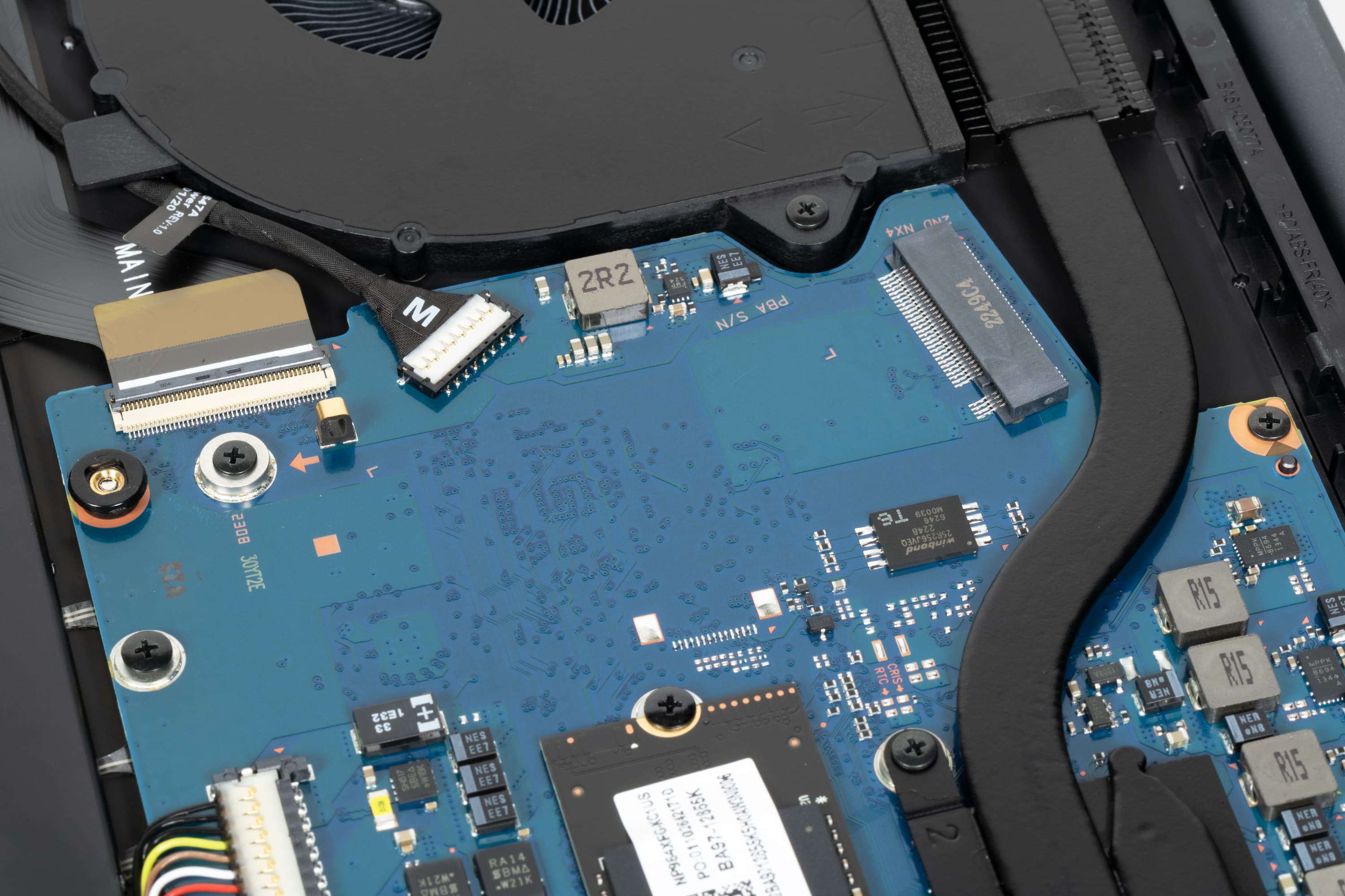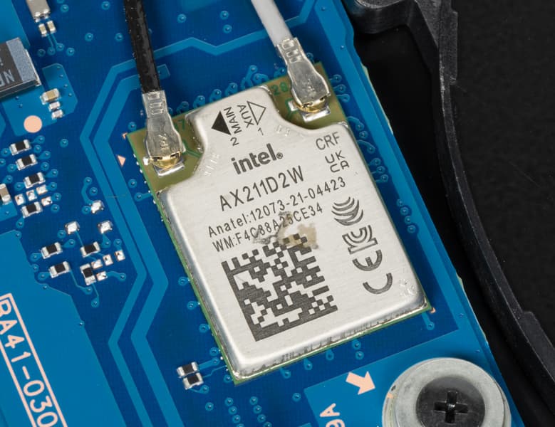На сателлите системной платы возле левого вентилятора установлен трехдиапазонный (2,4/5/6 ГГц) PCIe-адаптер беспроводной связи Intel AX211D2W (Wi-Fi 6E, 802.11ax), поддерживающий одновременный прием и передачу сигнала с использованием двух антенн при множественных подключениях (2×2 MIMO). Он же обеспечивает связь по Bluetooth 5.3. К сожалению, этот адаптер распаян на плате, как и процессор с оперативной памятью, поэтому заменить его в неспециализированных условиях нельзя.