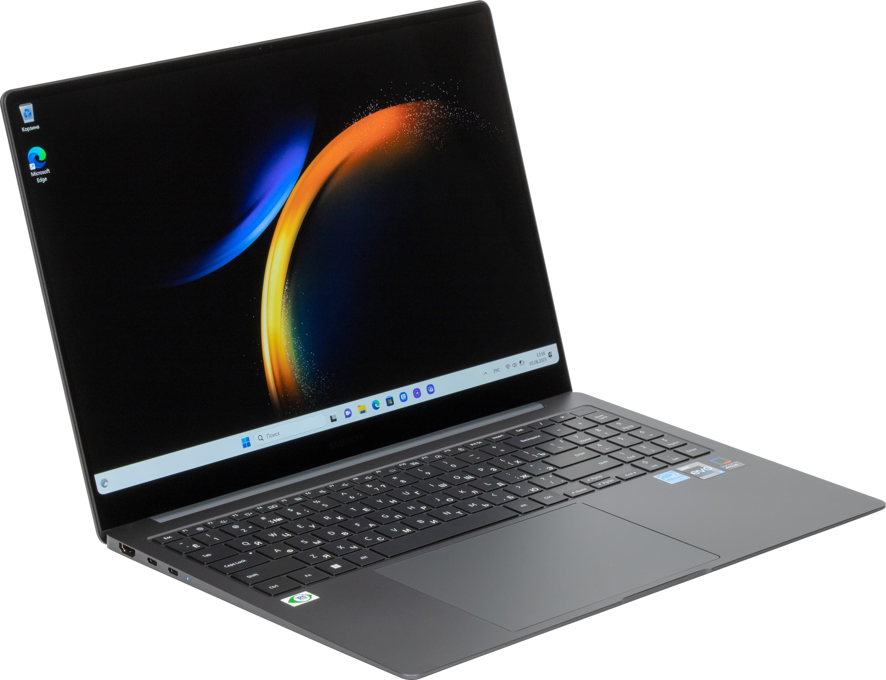 Тонкий (11 мм) и легкий (1,4 кг) ноутбук Samsung для бизнеса оснащен новейшим процессором Intel Core 13-го поколения со встроенным видеоускорителем, 32 ГБ оперативной памяти LPDDR5 с хорошими показателями быстродействия и довольно проворным терабайтным SSD-накопителем. Можно установить и второй NVMe-диск в свободный слот M.2 на системной плате. Главное достоинство новинки — отличный 16-дюймовый экран AMOLED сверхвысокого разрешения 3K (2880×1800) с соотношением сторон 16:10, отменной яркостью и широким цветовым охватом.