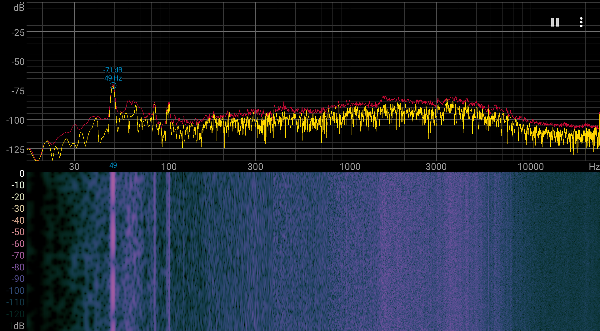 Если ноутбук не нагружать вообще или даже нагружать максимально, но при активном профиле Silent, то его система охлаждения работает в активном режиме, с вращающимися вентиляторами, но на типичном для расположения пользователя расстоянии уровень шума практически не превышает фонового значения. То есть пользователь этот шум не слышит. И даже в случае большой нагрузки при активном профиле High Performance шум от системы охлаждения умеренный. При этом характер шума ровный и не раздражает. Спектрограмма, полученная при максимальной нагрузке на CPU (профиль High Performance), достаточно ровная, и в диапазоне частот, где звуки могут вызывать особенное раздражение, выраженных пиков нет: