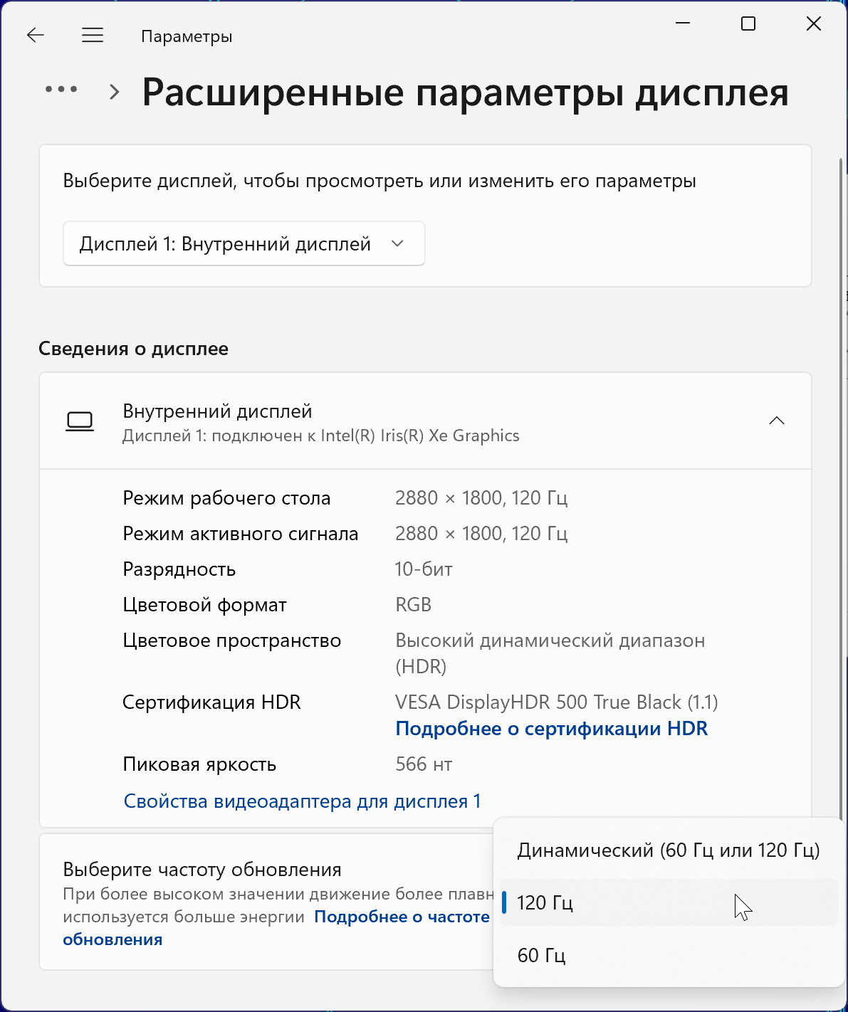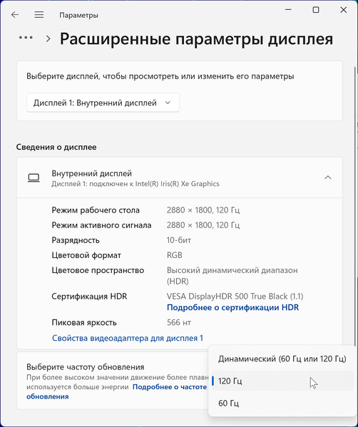 В настройках экрана доступны несколько частот обновления: