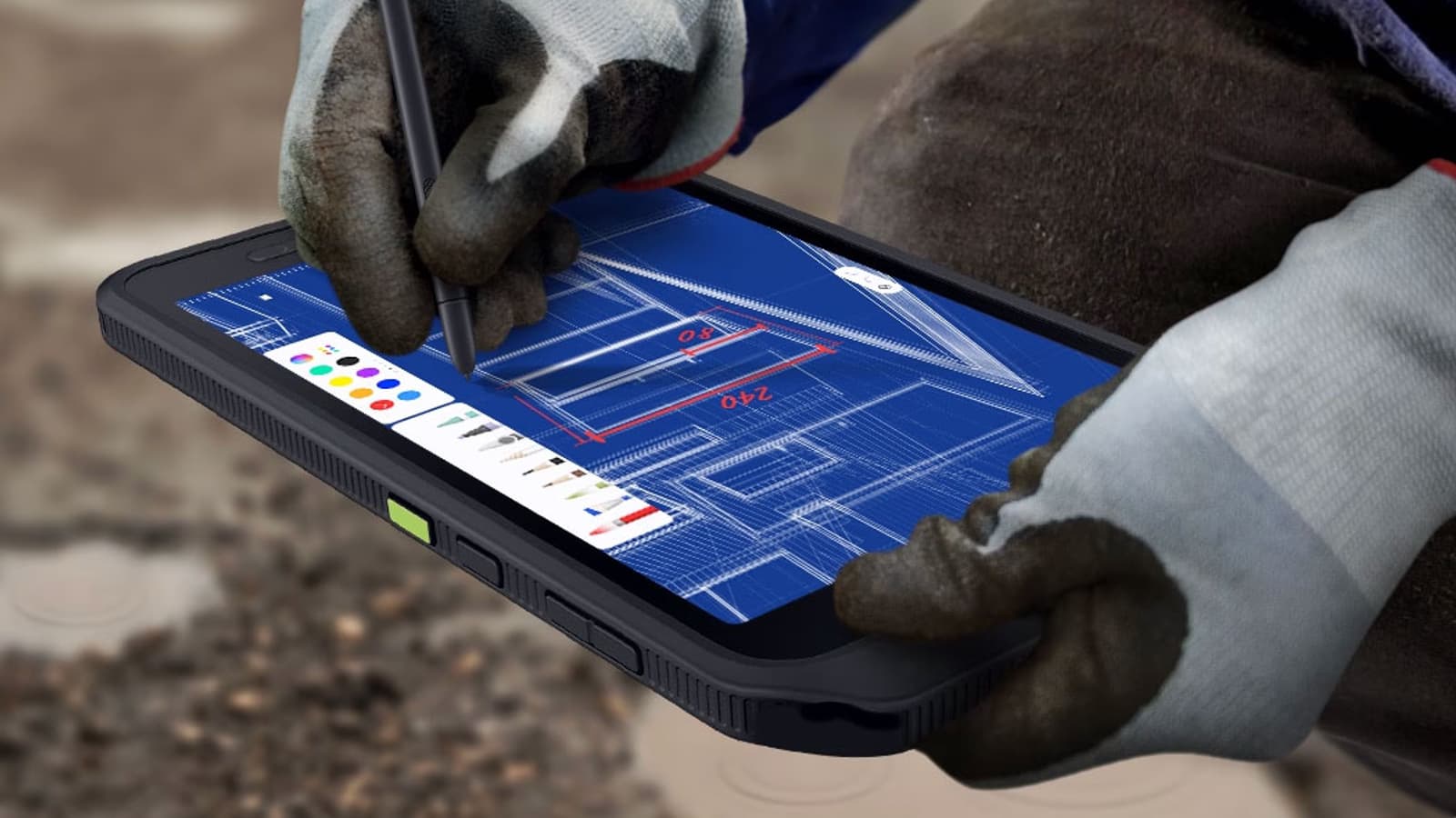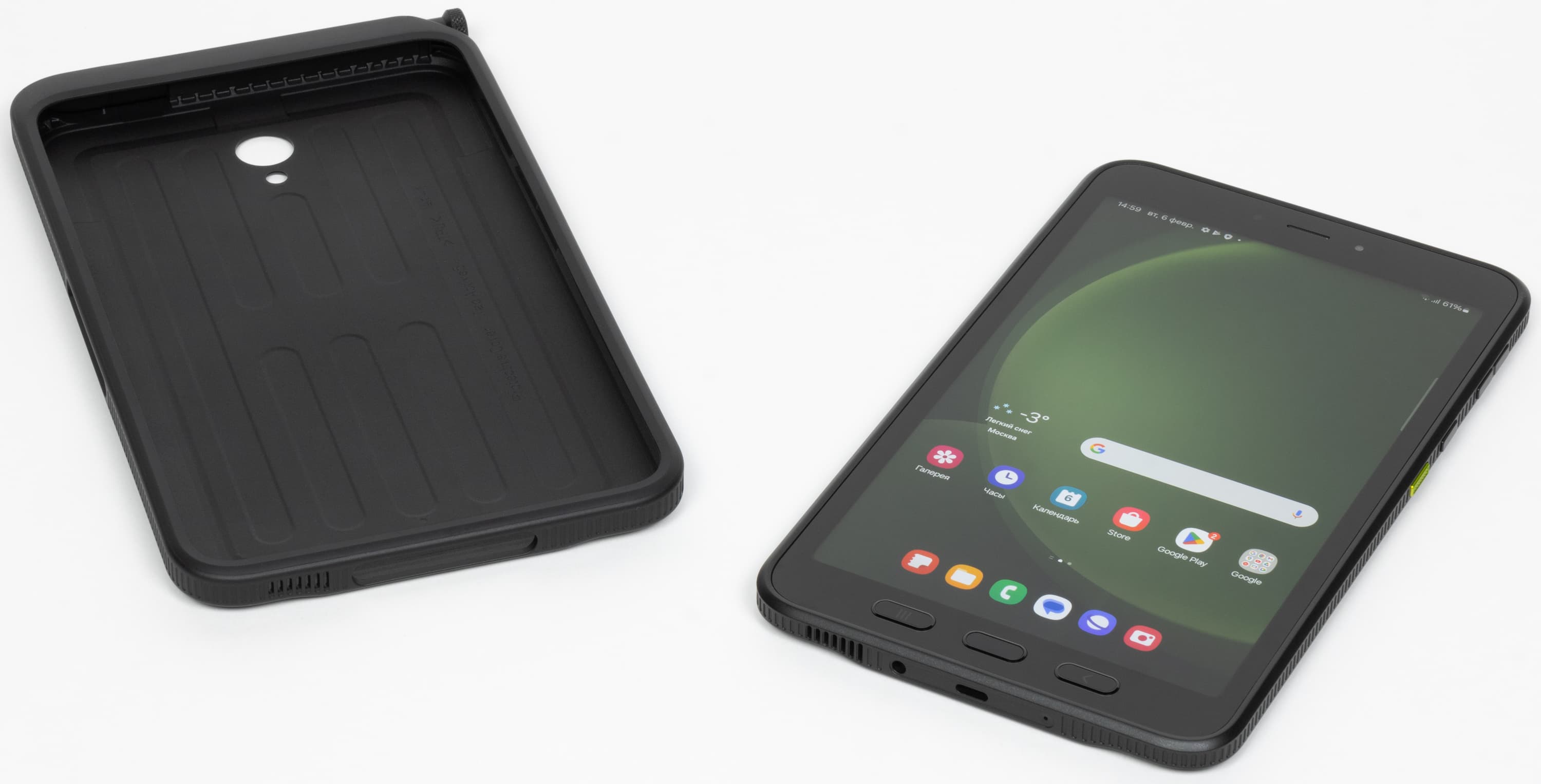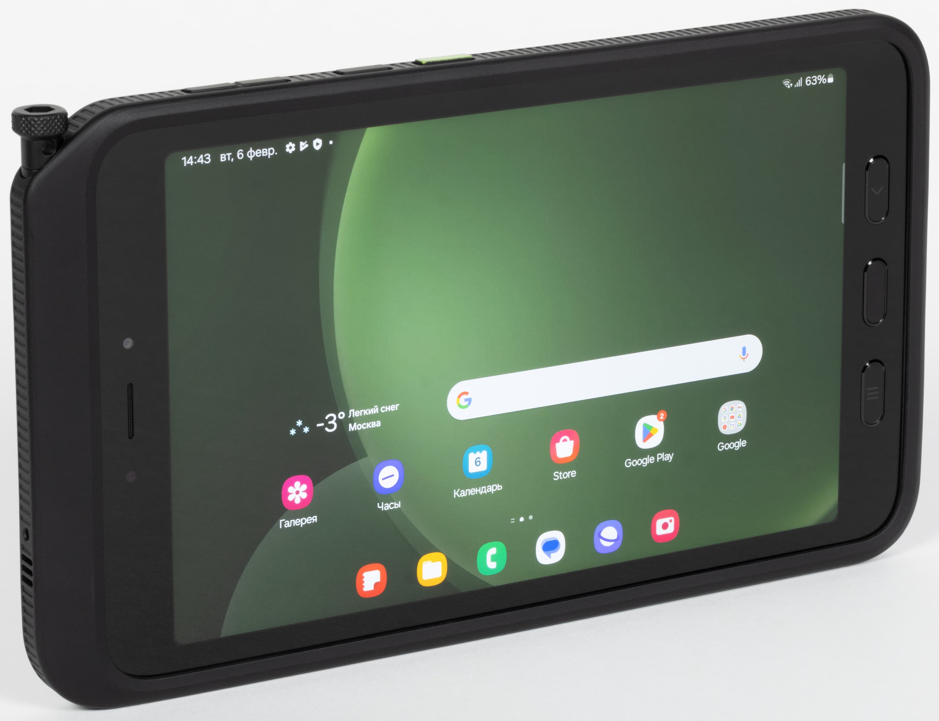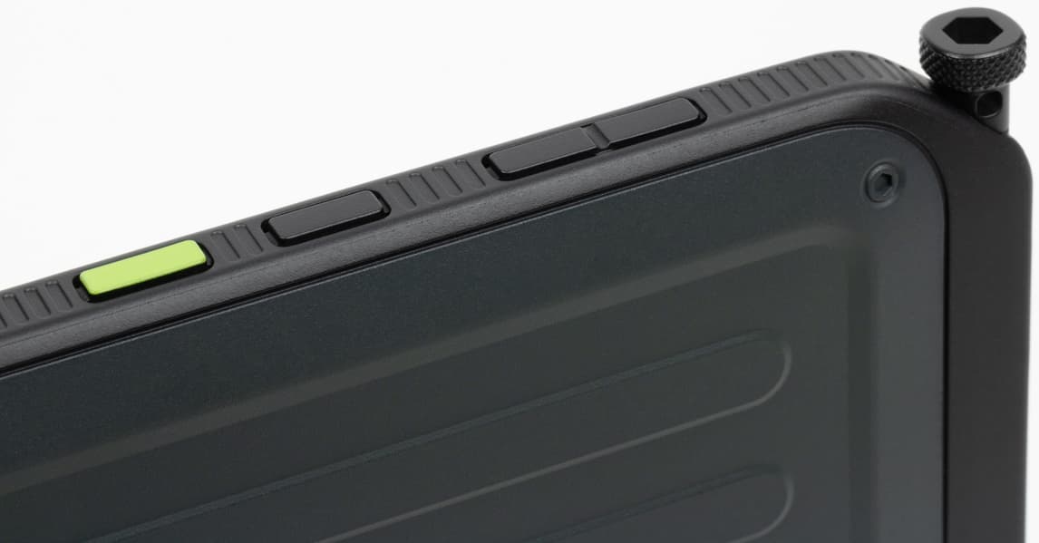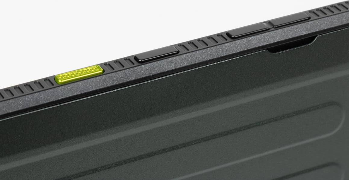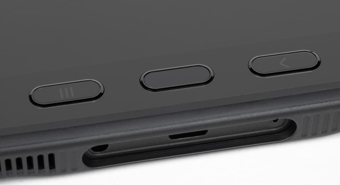 Три другие кнопки расположены не на боковой поверхности, а под экраном (если держать планшет в портретной ориентации). Это стандартные навигационные кнопки Android (список запущенных приложений, главный экран, назад), от которых мы уже почти отвыкли, поскольку их заменили экранные жесты (а ранее — экранные же кнопки). Дело в том, что сценарии использования этого планшета предполагают в том числе работу в перчатках, а доставать каждый раз стилус, чтобы вернуться на шаг назад, немного утомительно. Кнопки тактильно одинаковы, но мышечная память быстро восстанавливается, поэтому проблем у старых пользователей Android возникнуть не должно.
